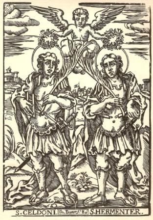 English: Wood engraving with the saints Emeterius and Celedonius |