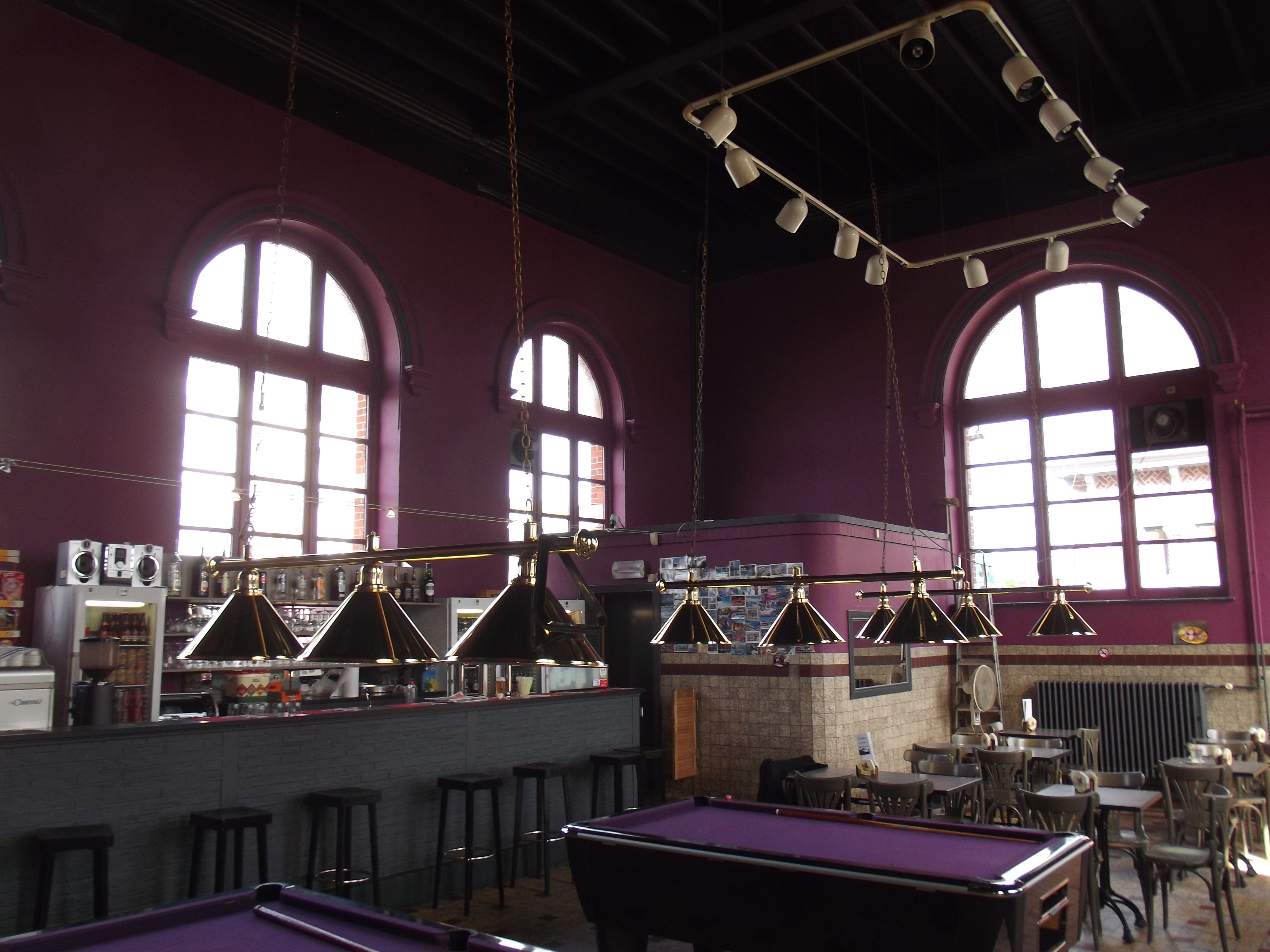 English: Café in the station with pool tables. |