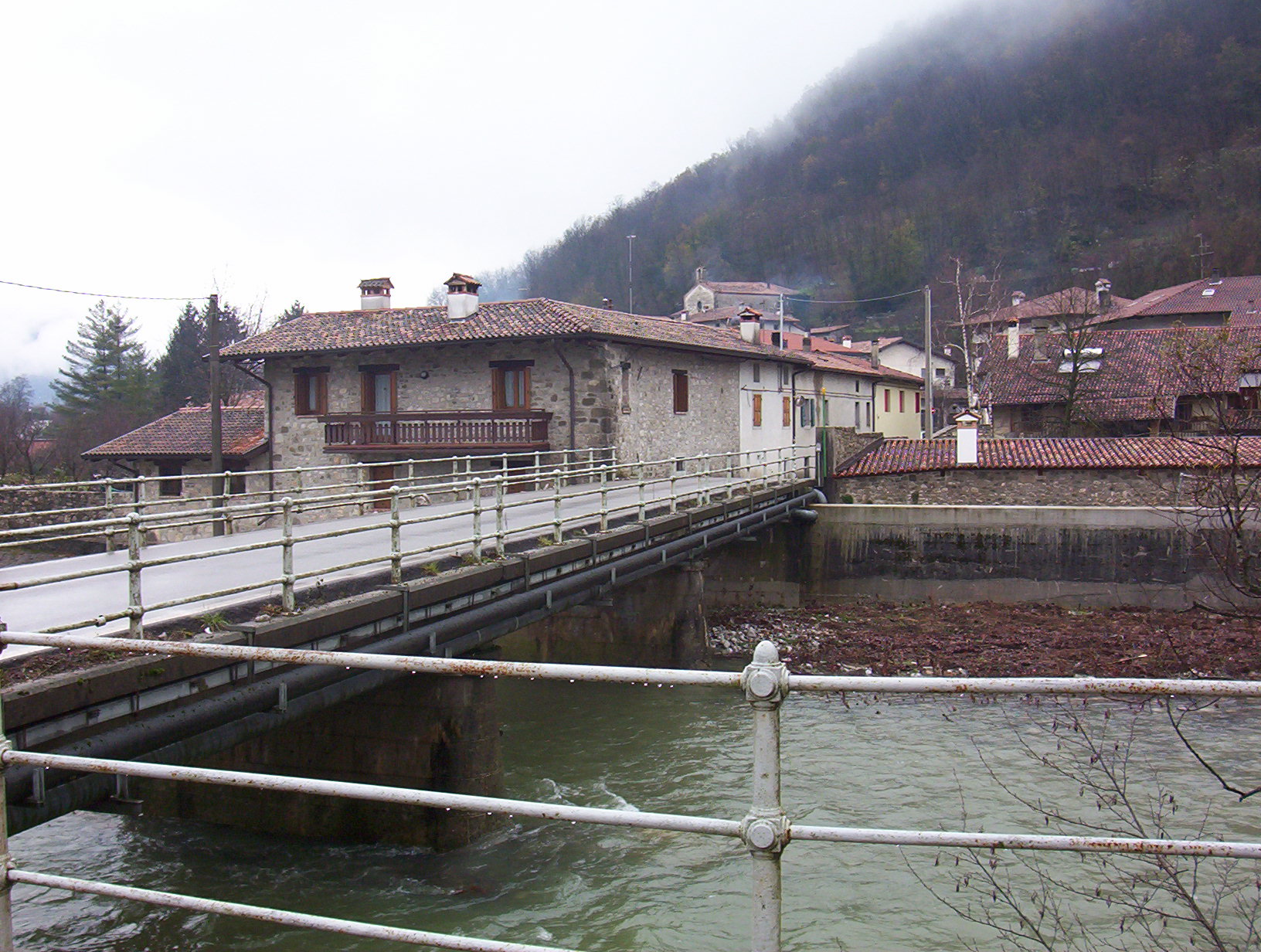 Italiano: Il ponte sul fiume Cosizza tra Merso di Sopra e Scrutto. Il centro abitato sullo sfondo è Scrutto, una frazione del comune di San Leonardo (UD), Italia. L'immagine è una fotografia scattata da Trevirgola e risale all'autunno 2005.