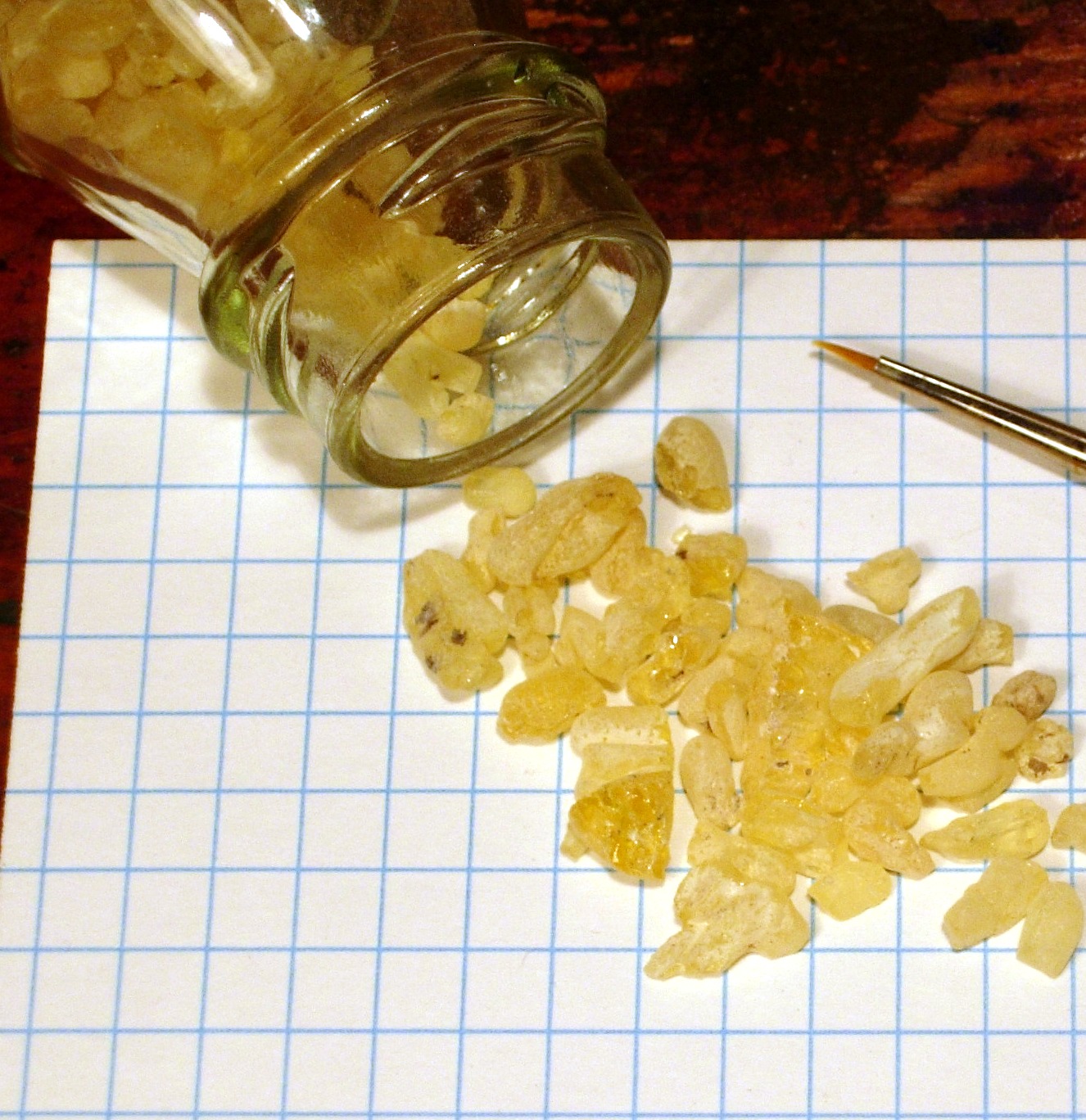 English: Sandarac tears 1/4" grid (approx. 6 mm squares) GIMP 2.6.6 auto color level adjust
