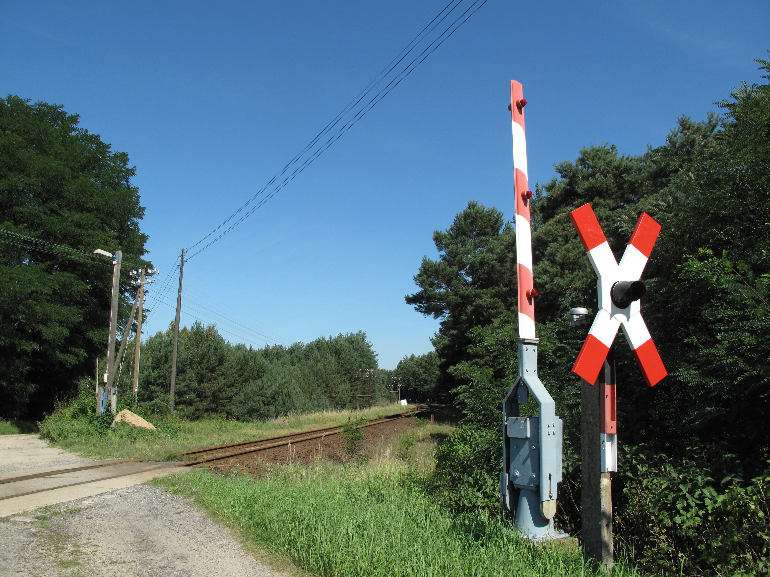 English: Level crossing of the Railway line Cottbus–Frankfurt (Oder) over the circular path around the Große Müllroser See in the Schlaube Valley Nature Park The nature park is situated in the District Oder-Spree, Brandenburg, Germany. |