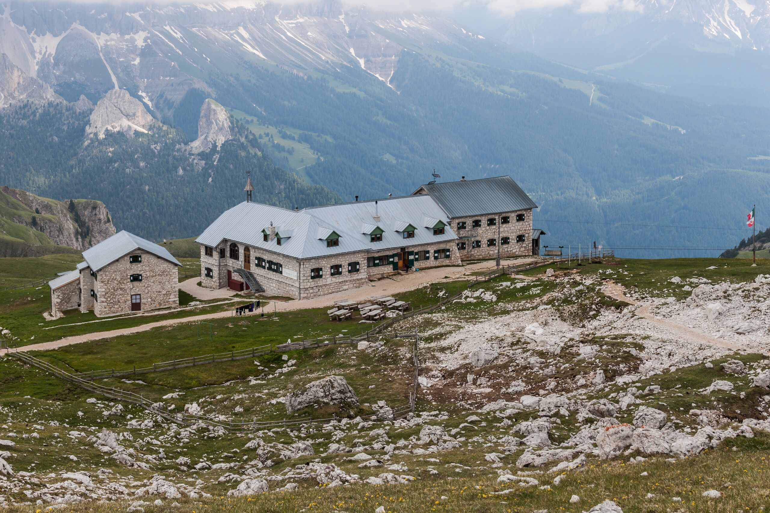 Deutsch: Das Schlernhaus (Rifugio Bolzano) vom Petz aus gesehen. Italiano: Il Rifugio Bolzano, visto dal monte Petz. English: The Schlernhaus as seen from mount Petz. The house is a refuge in the Rosengarten Group in South Tyrol. |