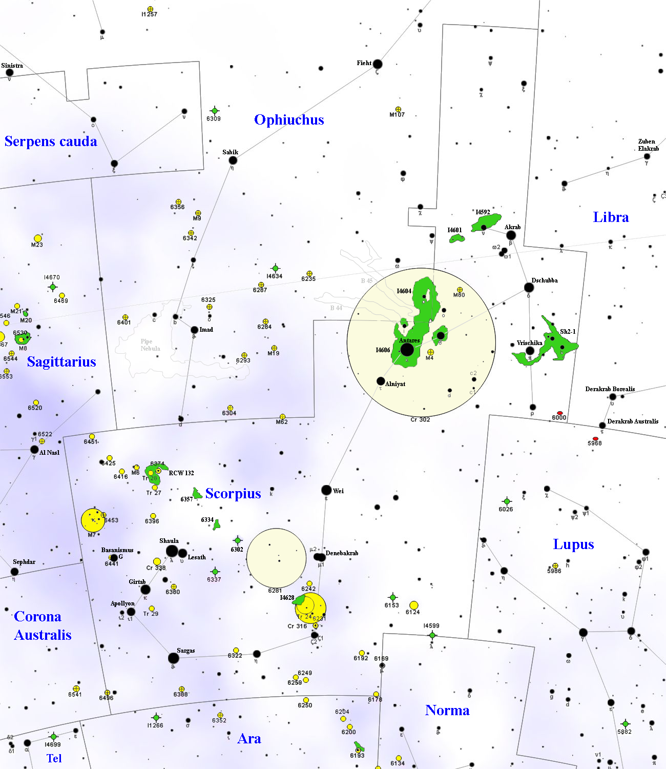 English: Scorpius constellation map, with DSOs |