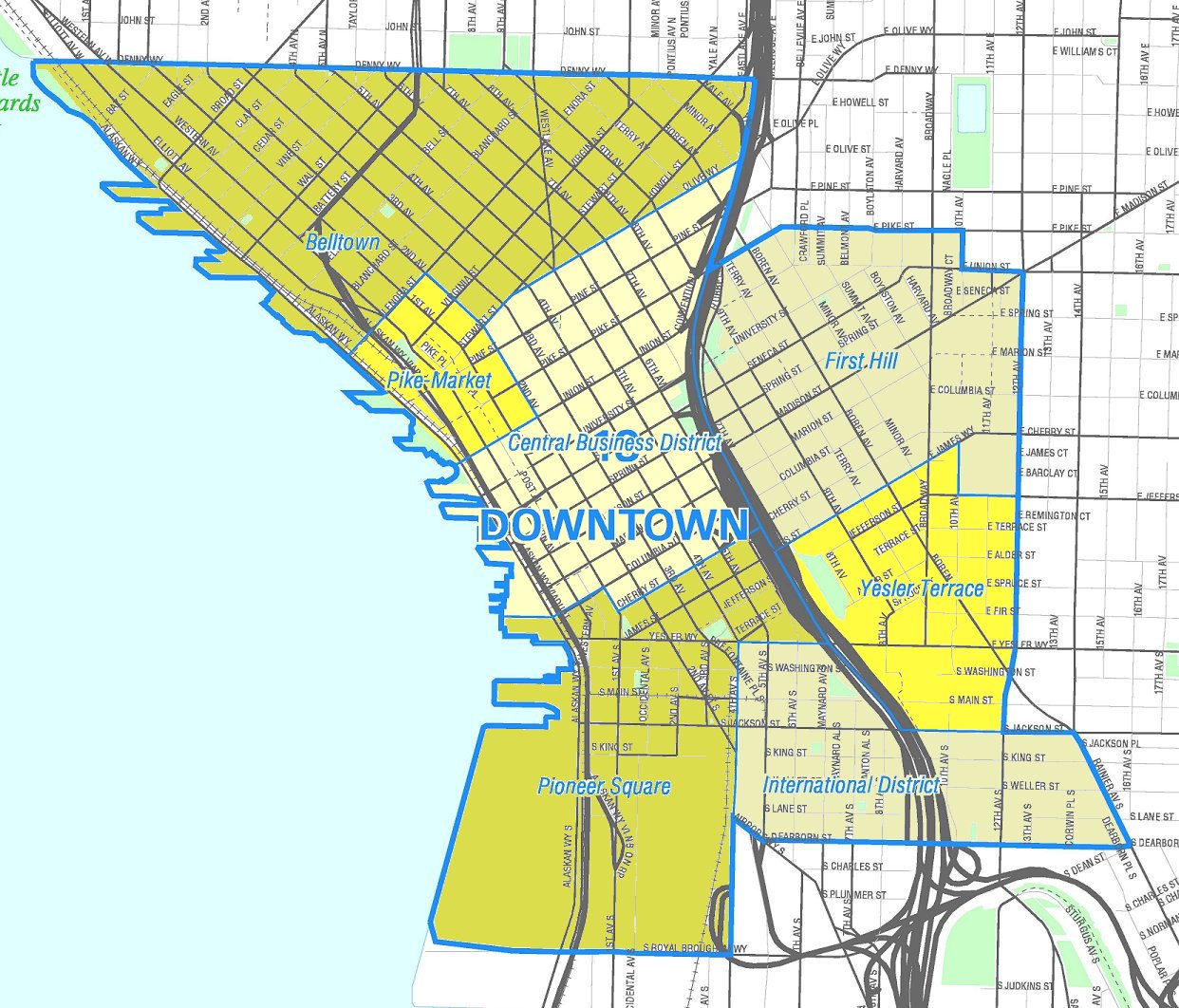 English: Map of Seattle's Downtown neighborhoods. Like the other maps from the Seattle City Clerk's Neighborhood Map Atlas, this is not an official map; in particular, borders are not official.