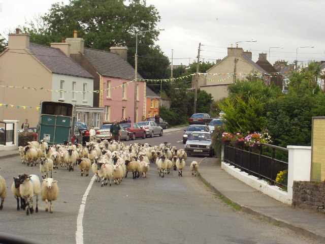English: Sheep at Anascaul bridge. Sheep being herded along the main street of Anascaul, across the bridge. |
