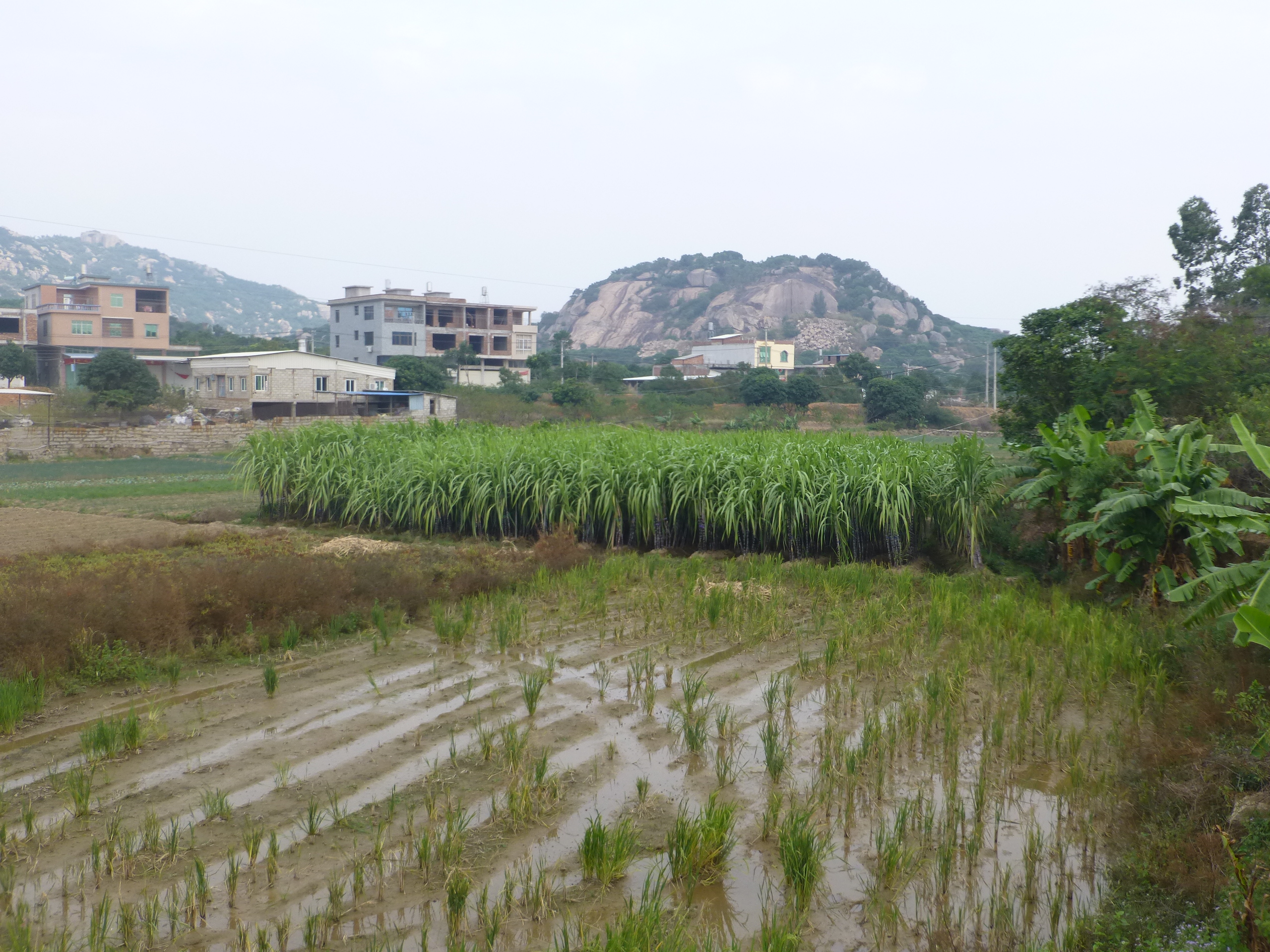 English: A rural landscape in Shentu Town, Zhangpu County, Fujian, Somewhere east of Shanwei Village 山尾村. Rice, sugar cane, banana plants. |