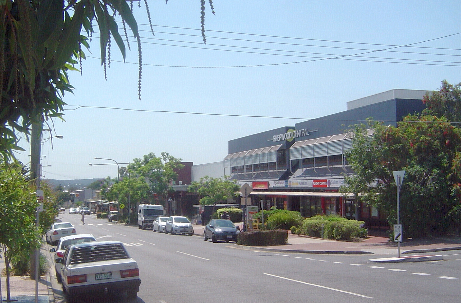 English: Photograph of Sherwood Road and shops in Sherwood, Brisbane, Queensland, Australia looking east. |