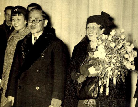 (Japanese) Deutsch: Ankunft des neuen japanischen Botschafters in Berlin 1937: in der Mitte Botschafter Shigenori Tôgô, rechts neben ihm seine deutsche Ehefrau Edith Tôgô; links neben ihm die gemeinsame Tochter Ise Tôgô. |
