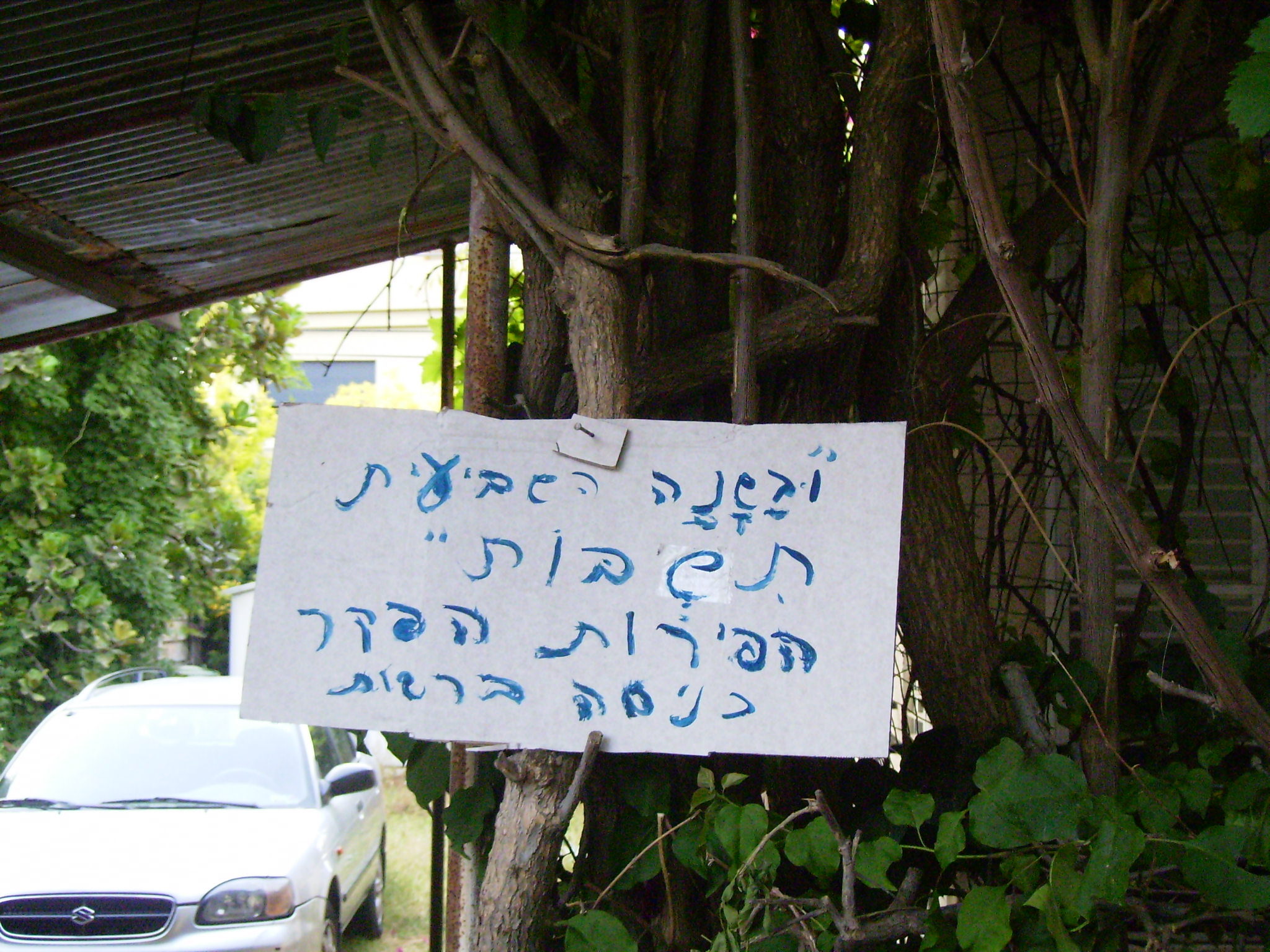 English: A resident of Holon, Israel, announcing the fruits on the trees in his backyard are hefker (abandoned property) on the occasion of shnat shmita بالعبرية: תושב חולון מודיע כי הפירות על העצים בחצרו הם הפקר לרגל שנת שמיטה |