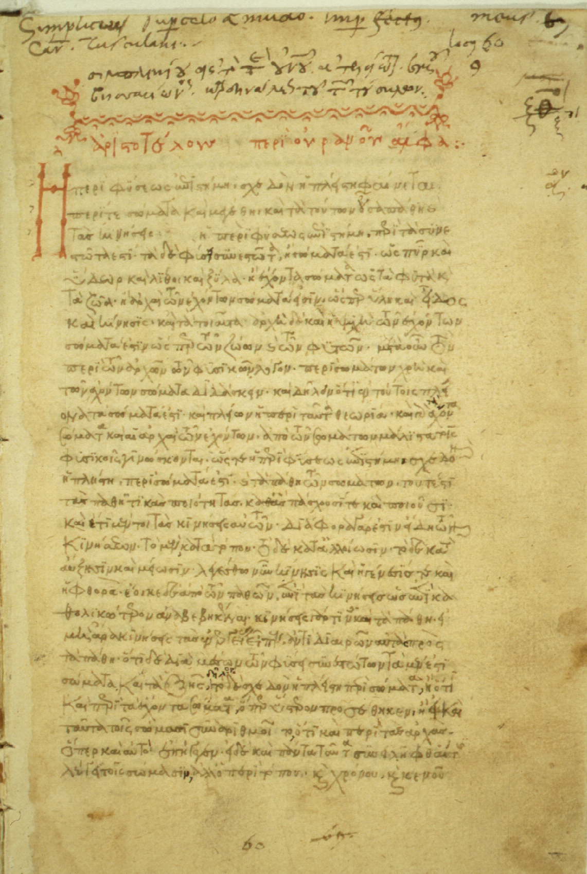 English: Commentatary on Aristotle's De caelo by Simplicius of Cilicia (sixth century AD). This manuscript is signed by a former owner, Cardinal Bessarion, whose household in Rome was an important center of Greek studies. |