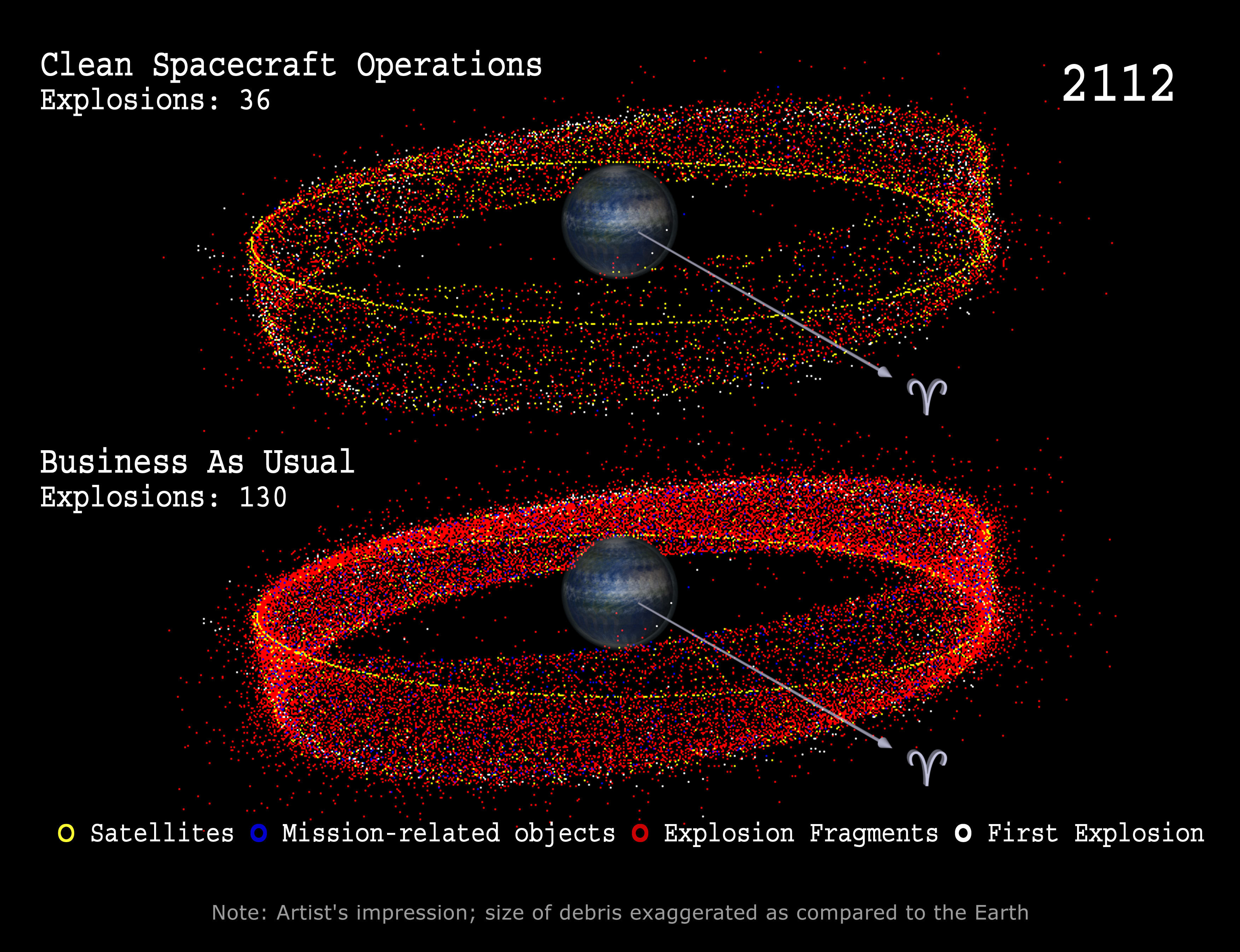 This image shows a simulation of the future GEO environment in the case when no measures are taken; this is the "business-as-usual" scenario. In the top panel, with mitigation measures, a much cleaner space environment can be observed, if the number of explosions is reduced drastically, and if no mission-related objects are ejected. However, to stop the ever-increasing amount of debris, more ambitious mitigation measures must be taken. In the long run, spacecraft and rocket stages have to be returned to Earth after completion of their mission. It is crucial to that we start immediately to implement mitigation measures. |