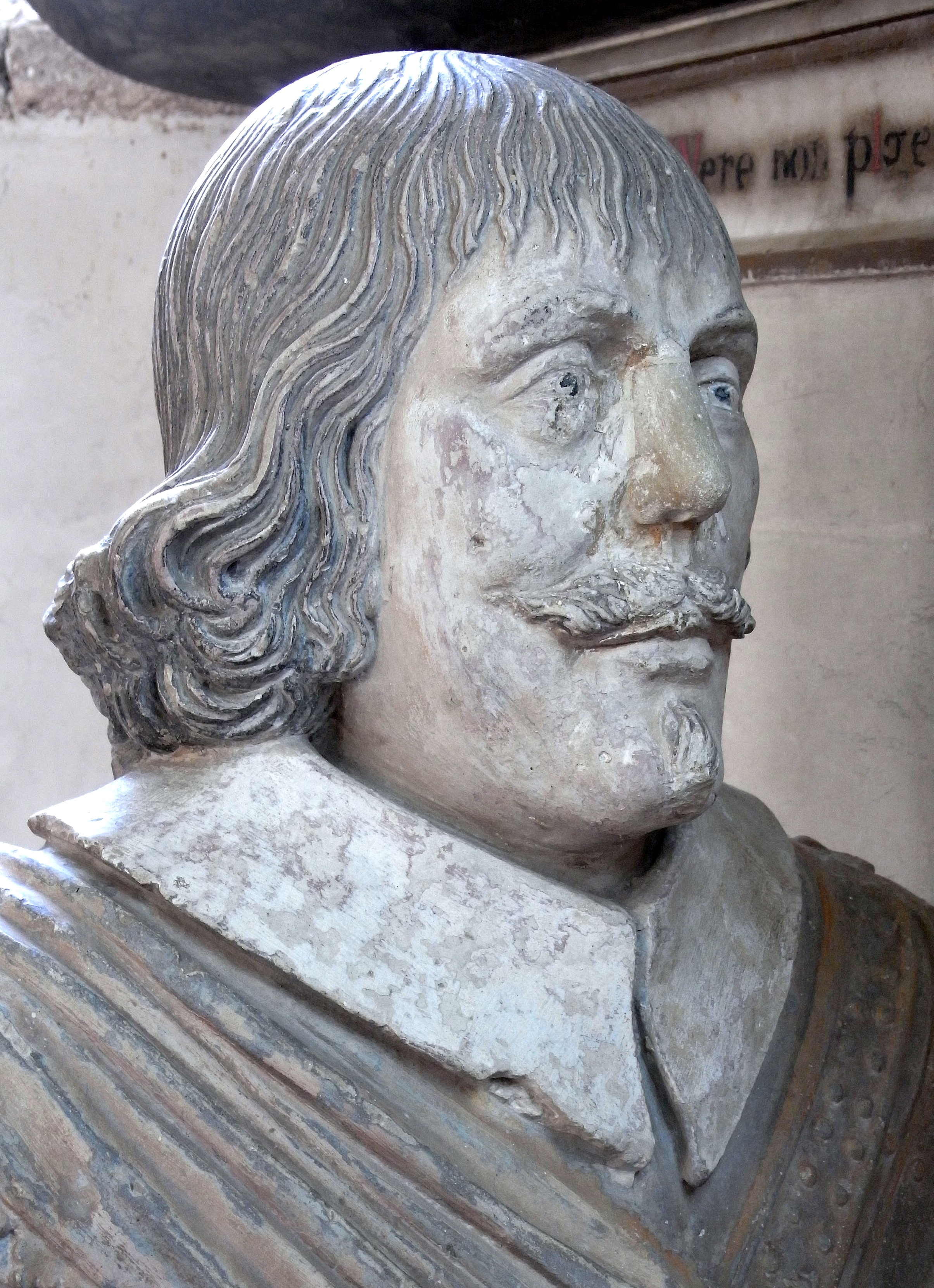 English: Sir John Northcote, 1st Baronet (1599-1676), detail of his kneeling effigy at base of monument he erected to his father John Northcote (1570-1632) in Newton St Cyres Church, Devon |