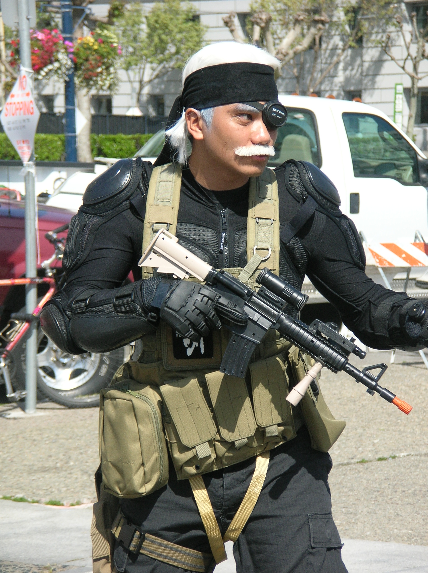 Description A cosplayer portraying Solid Snake from Metal Gear Solid 4: Guns of the Patriots competing in the costume contest at the Northern California Cherry Blossom Festival.