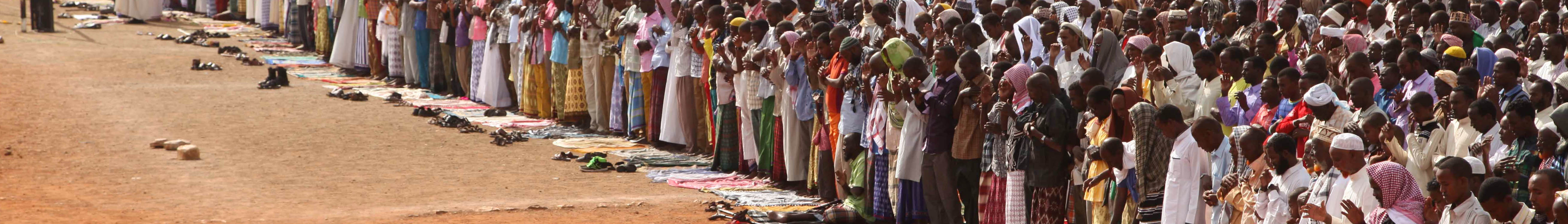 English: Muslims pray in Baidoa, Somalia, during Eid al-Fitr on July 28. AMISOM Photo / Abdi Dagane |