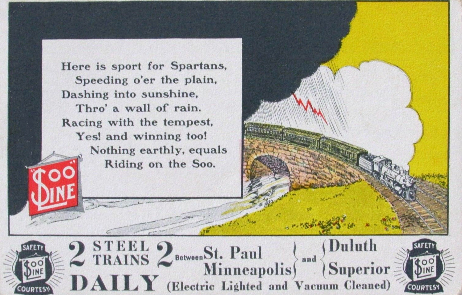 | Description | Postcard ad for the Soo Line's passenger trains between Duluth/Superior and St. Paul. |