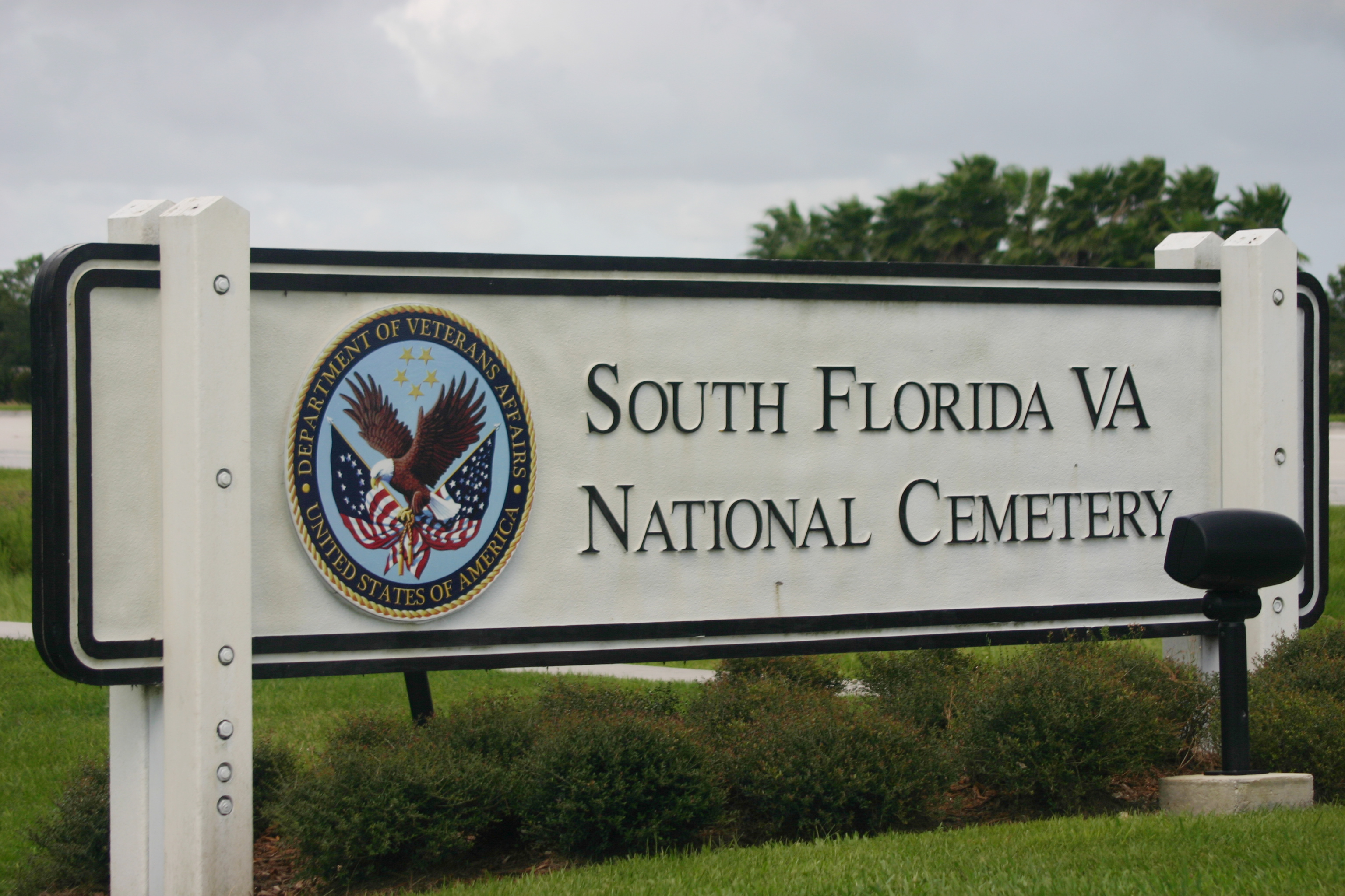 English: A sign in front of the main entrance for the South Florida VA National Cemetery, located in Lake Worth, Florida. |
