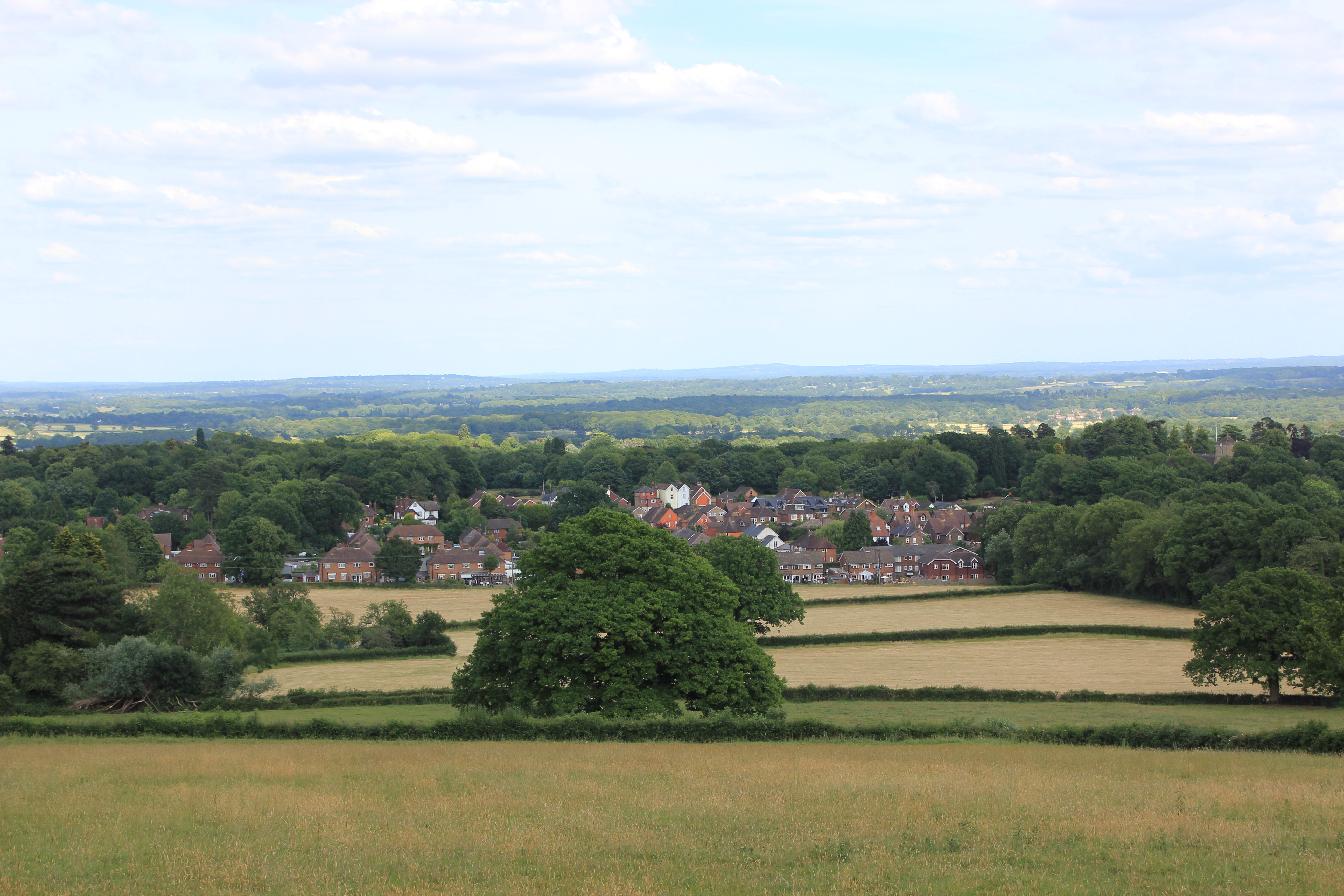 English: View of the Surrey village of South Holmwood from a field near Redlands Wood on Leith Hill |