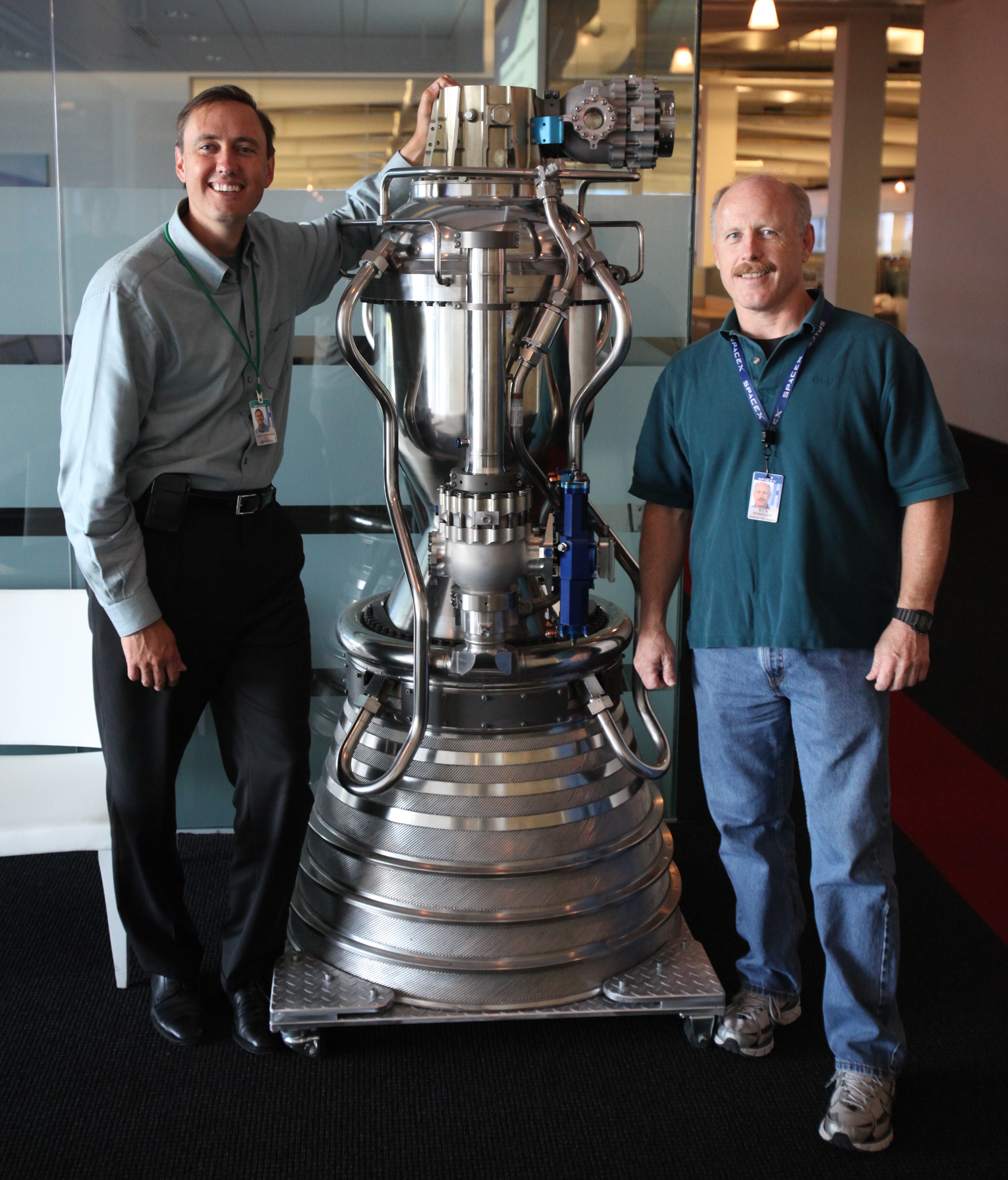 English: Steve Jurvetson (left) and Ken Bowersox (right), sporting the STS-73 shirt he wore while on the ISS… and reflecting on the beauty of a shiny SpaceX Merlin 1c engine this afternoon. |