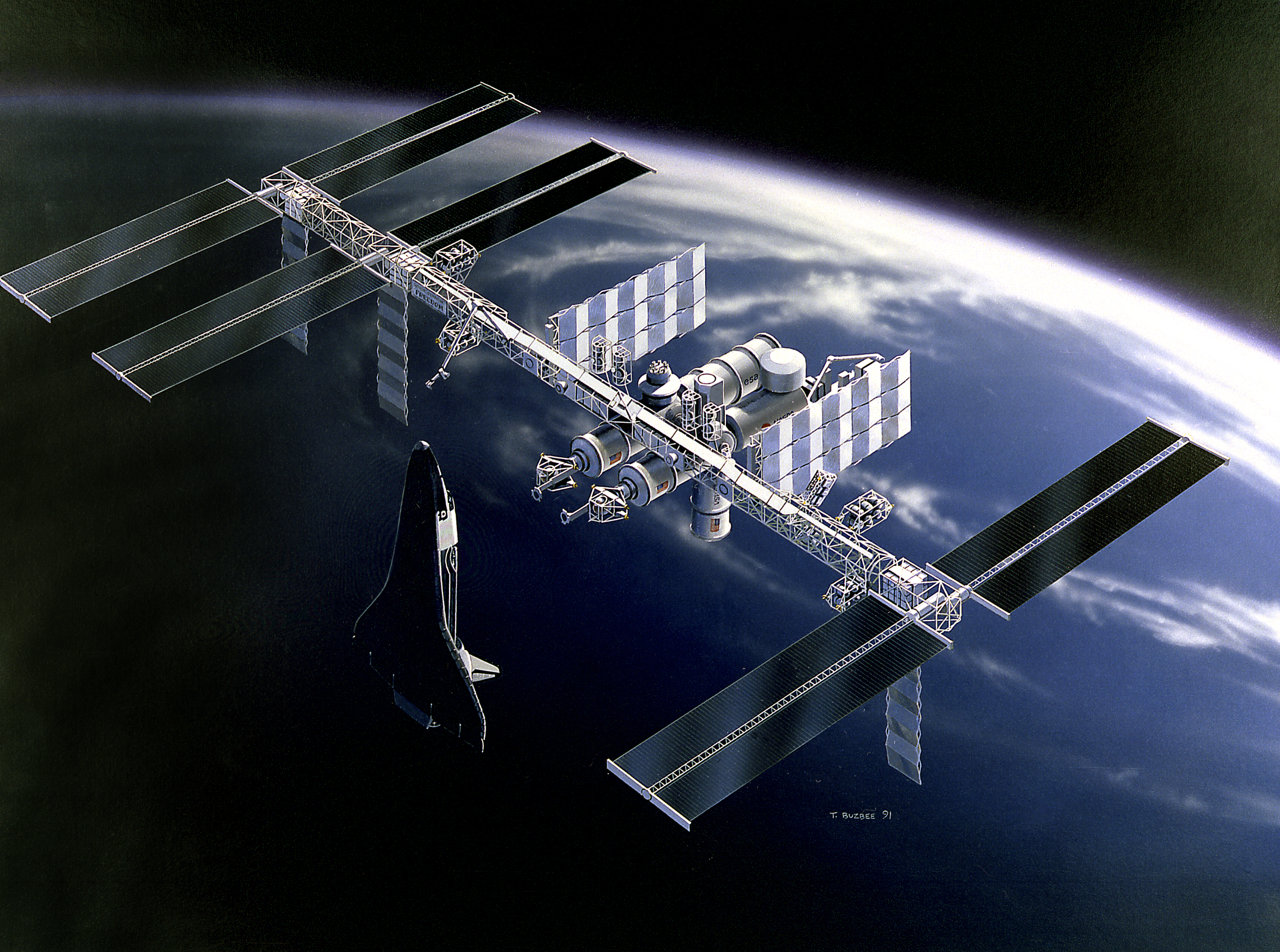 - 2005-05-08 00:37 Shimgray 720×535×8 (349357 bytes) NASA picture ID MSFC-9139926 from [http://mix.msfc.nasa.gov/IMAGES/MEDIUM/9139926.jpg MSFC]. 1991 artist's rendition by Tom Buzbee of the proposed [[Space Station Freedom]] design as of early 1991. {{PD-USGov-NASA}}