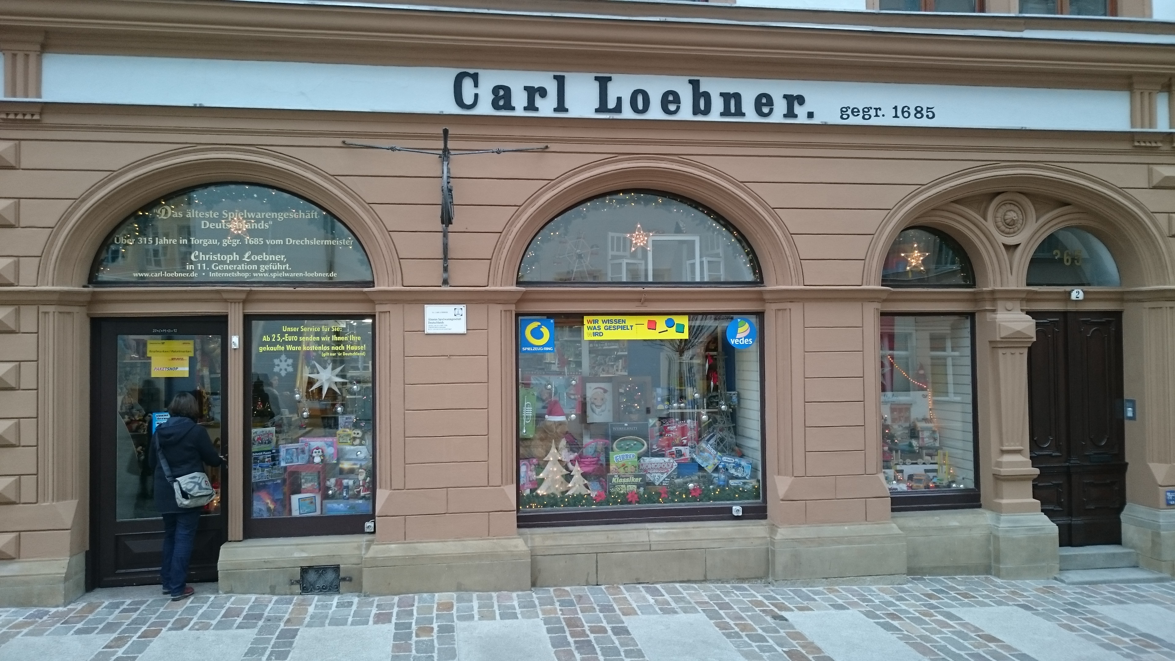Deutsch: Spielwarengeschäft Carl Loebner in Torgau, Bäckerstr. 2, im Dezember 2015. Es ist das älteste Spielwarengeschäft Deutschlands gegr. 1685. |