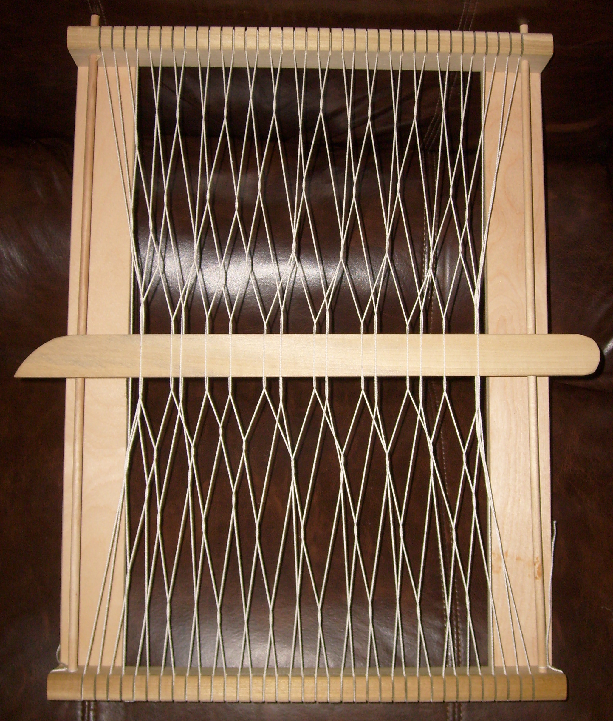 English: Demonstration example of sprang under construction on a lap loom. |