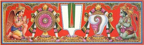 English: Sri Vaishnav Urdhva pundram along with Lord Vishnu's conch & discus flanked by Garuda and Hanuman on either side. |