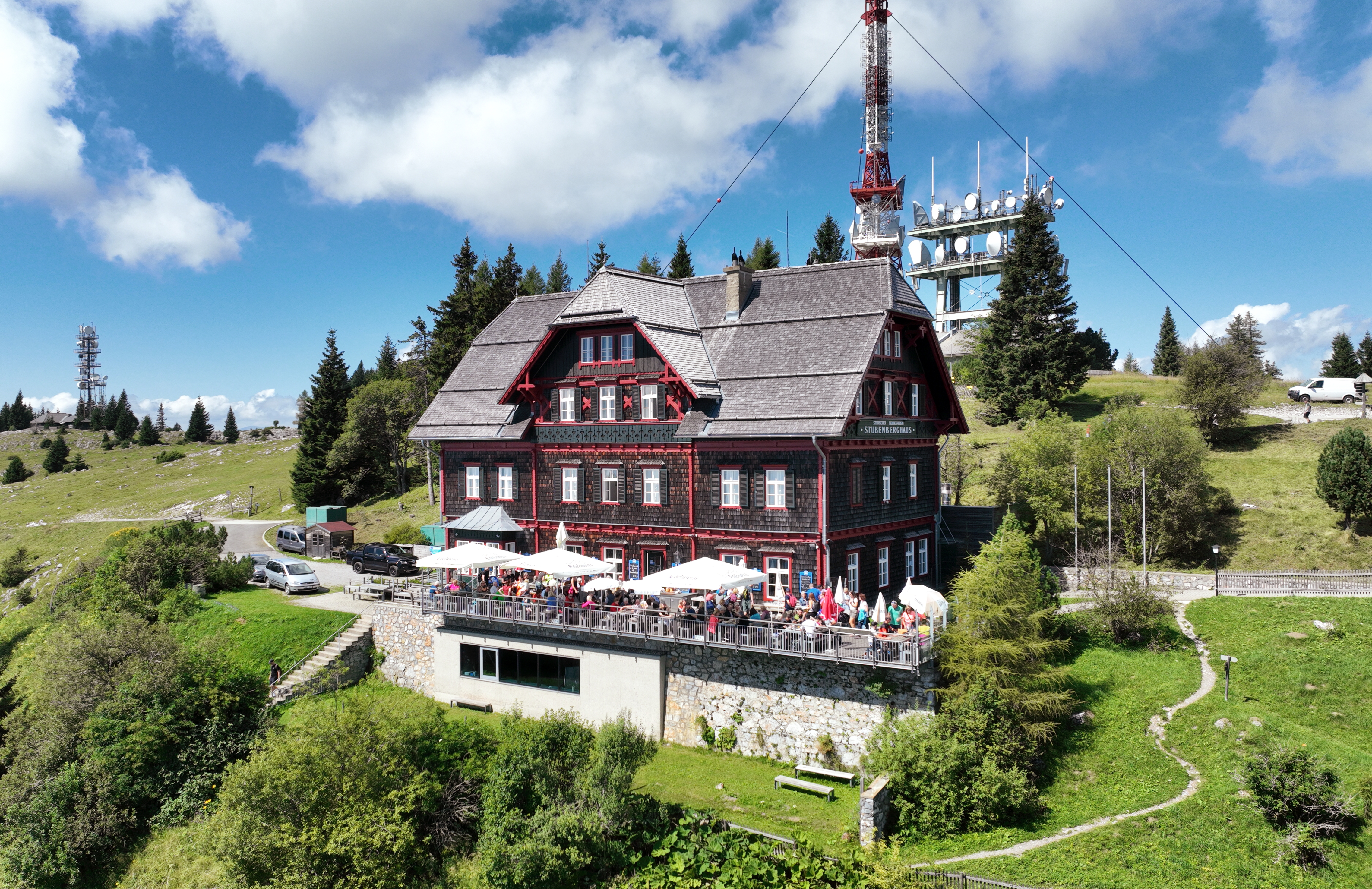 Deutsch: Ostsüdostansicht des Stubenberghaus auf dem Gipfel des 1445 m hohen Stöckls in der steiermärkischen Gemeinde St. Radegund bei Graz und dahinter der Sender Stöckl.