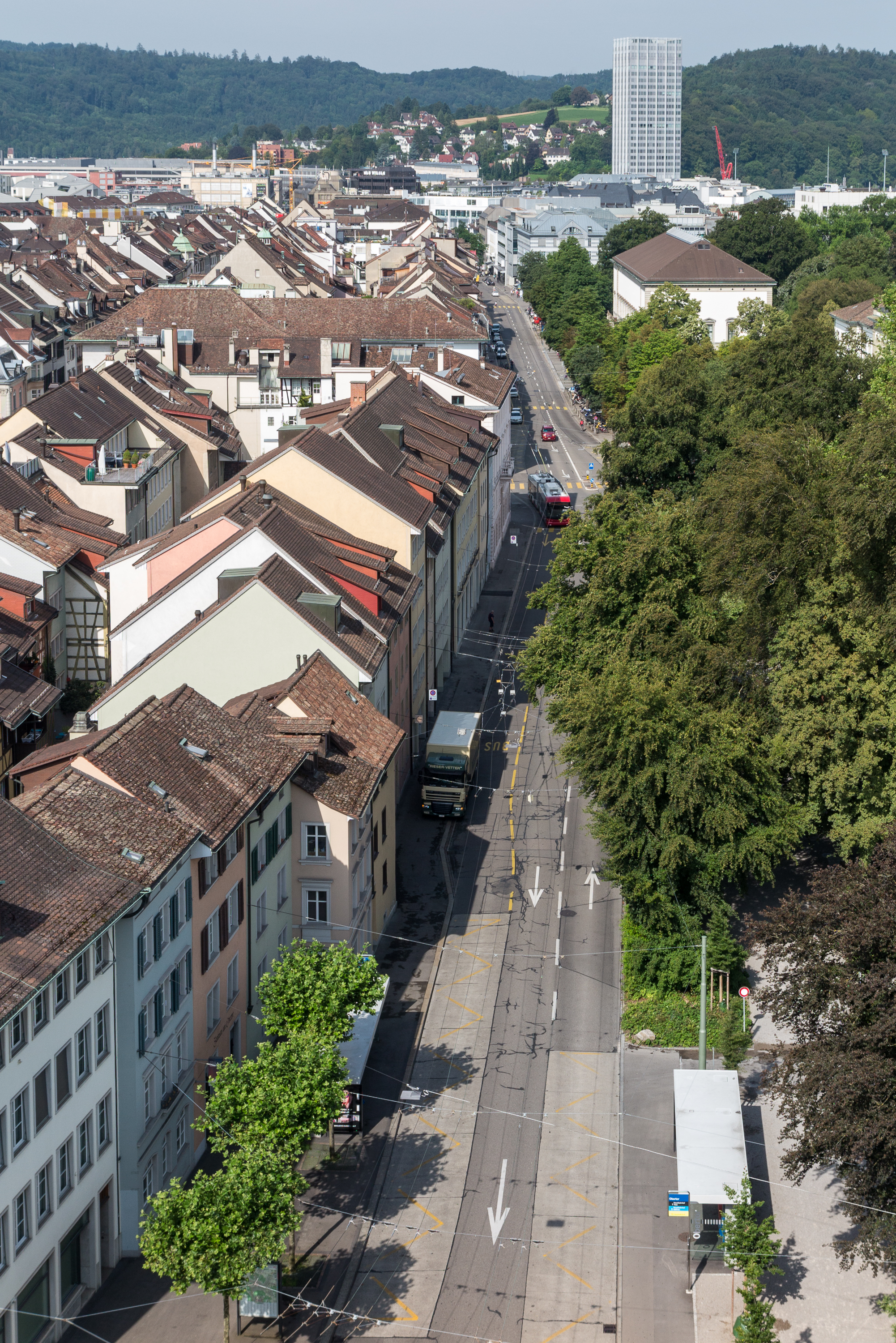 Blick von der General Guisan Strasse auf die Stadthausstrasse und einen Teil der Altstadt, im Hintergrund ist das Sulzer-Hochhaus zu erkennen.