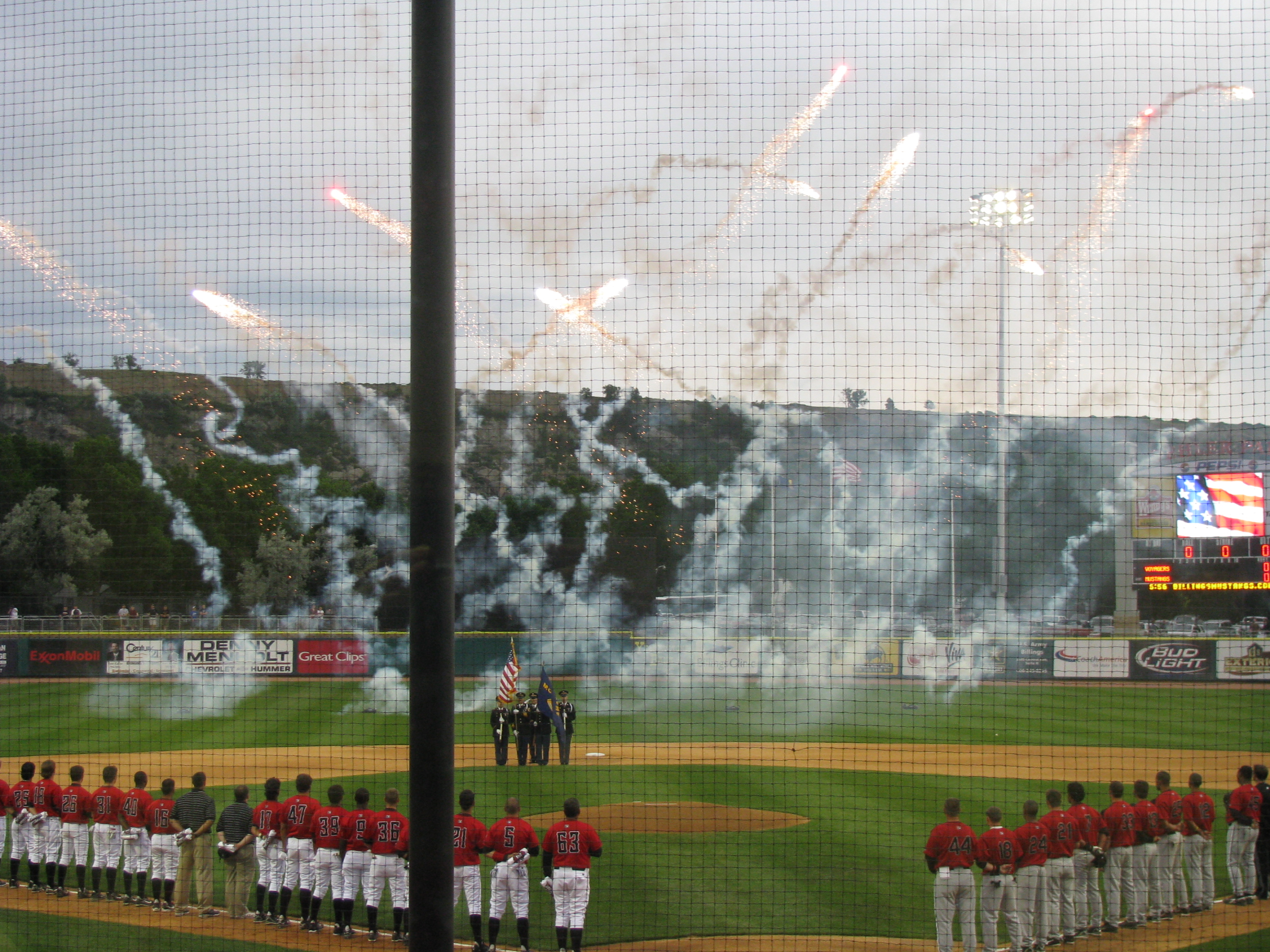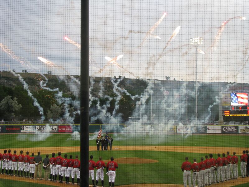 English: Taken during the fireworks intro at Dehler Park during the first Billings Mustangs game at the field. |