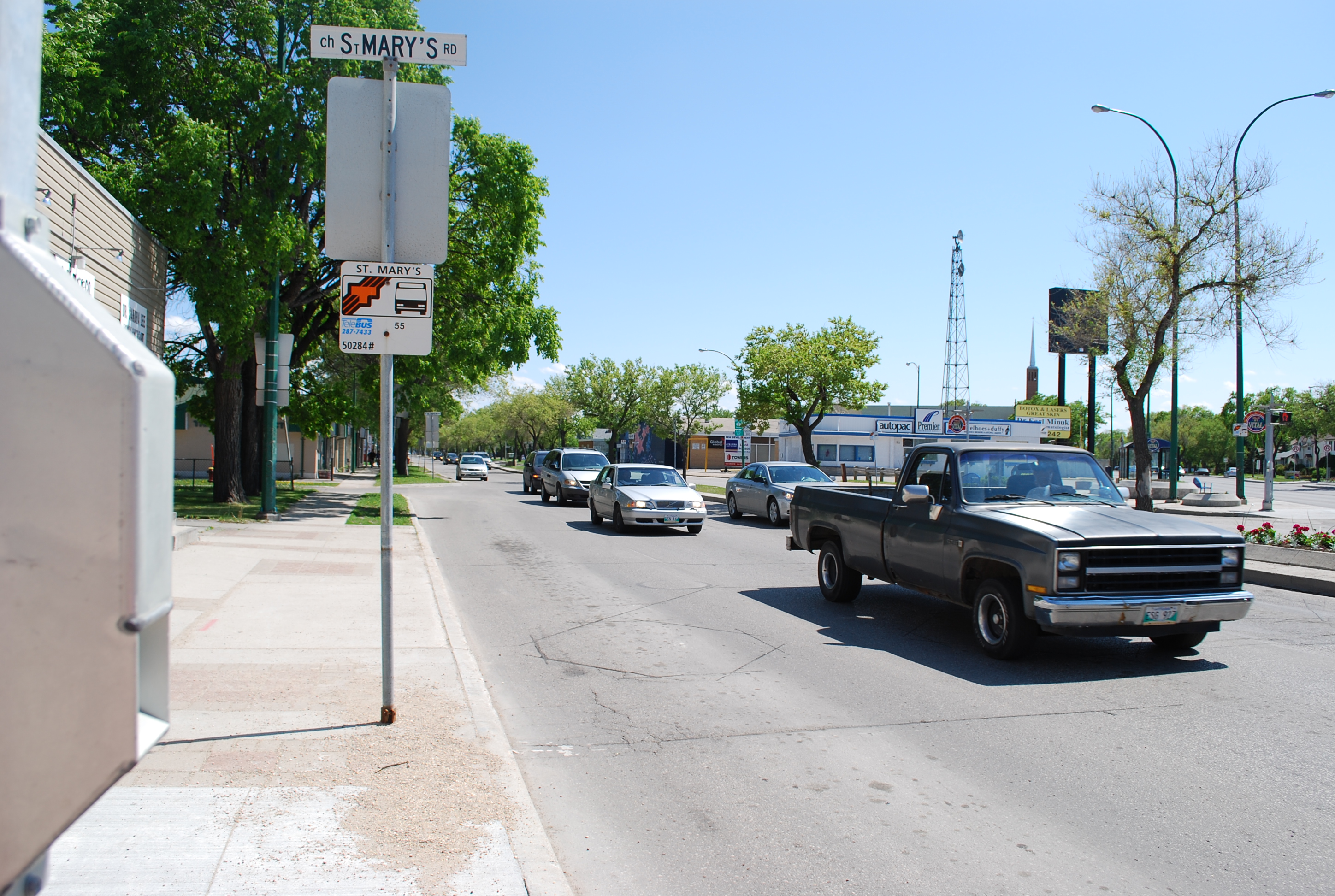 English: St. Anne's Junction, North St. Vital, Winnipeg - junction of St. Anne's and St. Mary's Roads looking southbound along St. Anne's Road. The neighbourhood on the extreme right is Elm Park, on the centre right is Varennes, on the left is Glenwood. |