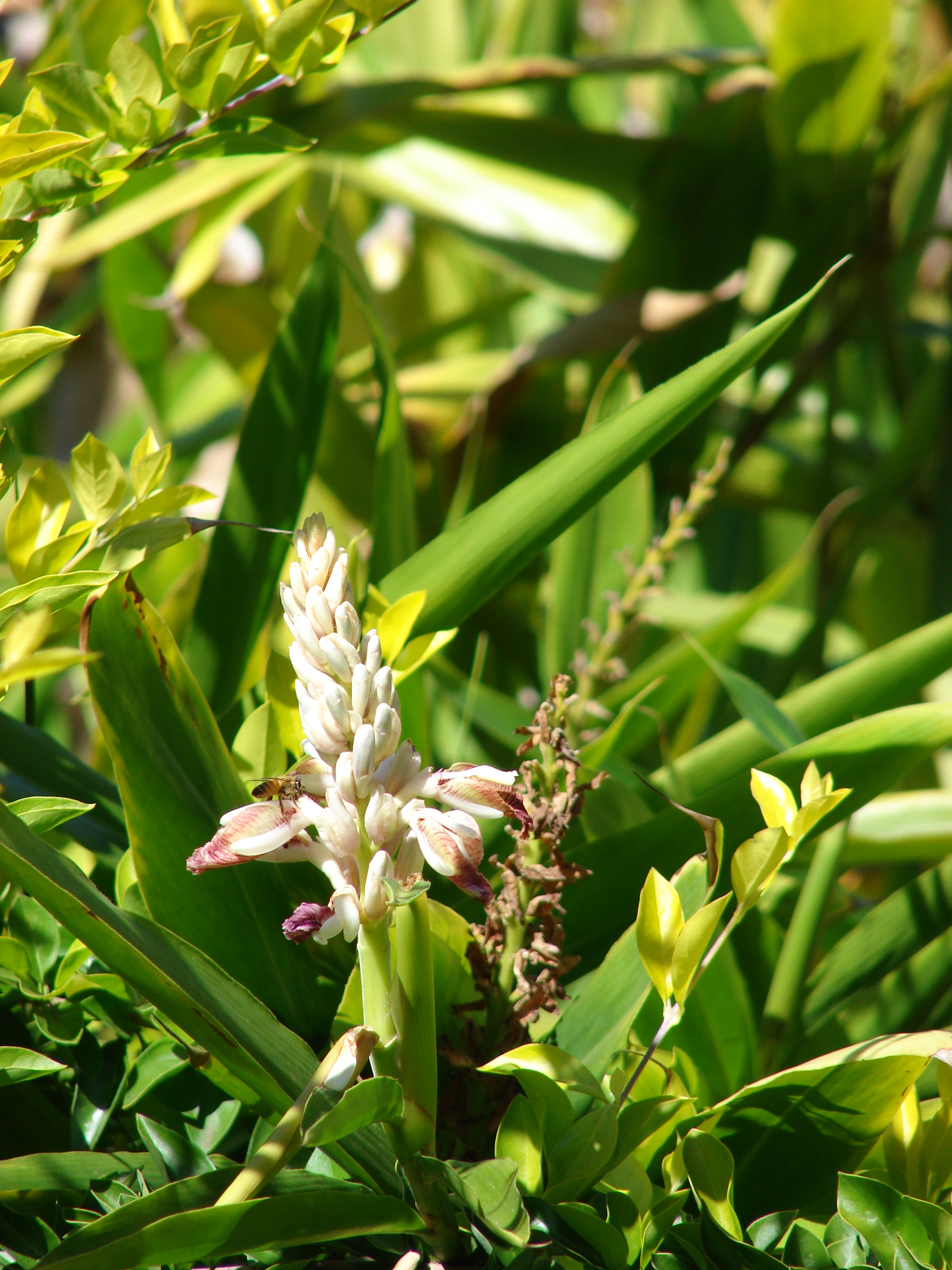 English: Alpinia calcarata (leaves and flowers). Location: Maui, Enchanting Floral Gardens of Kula |