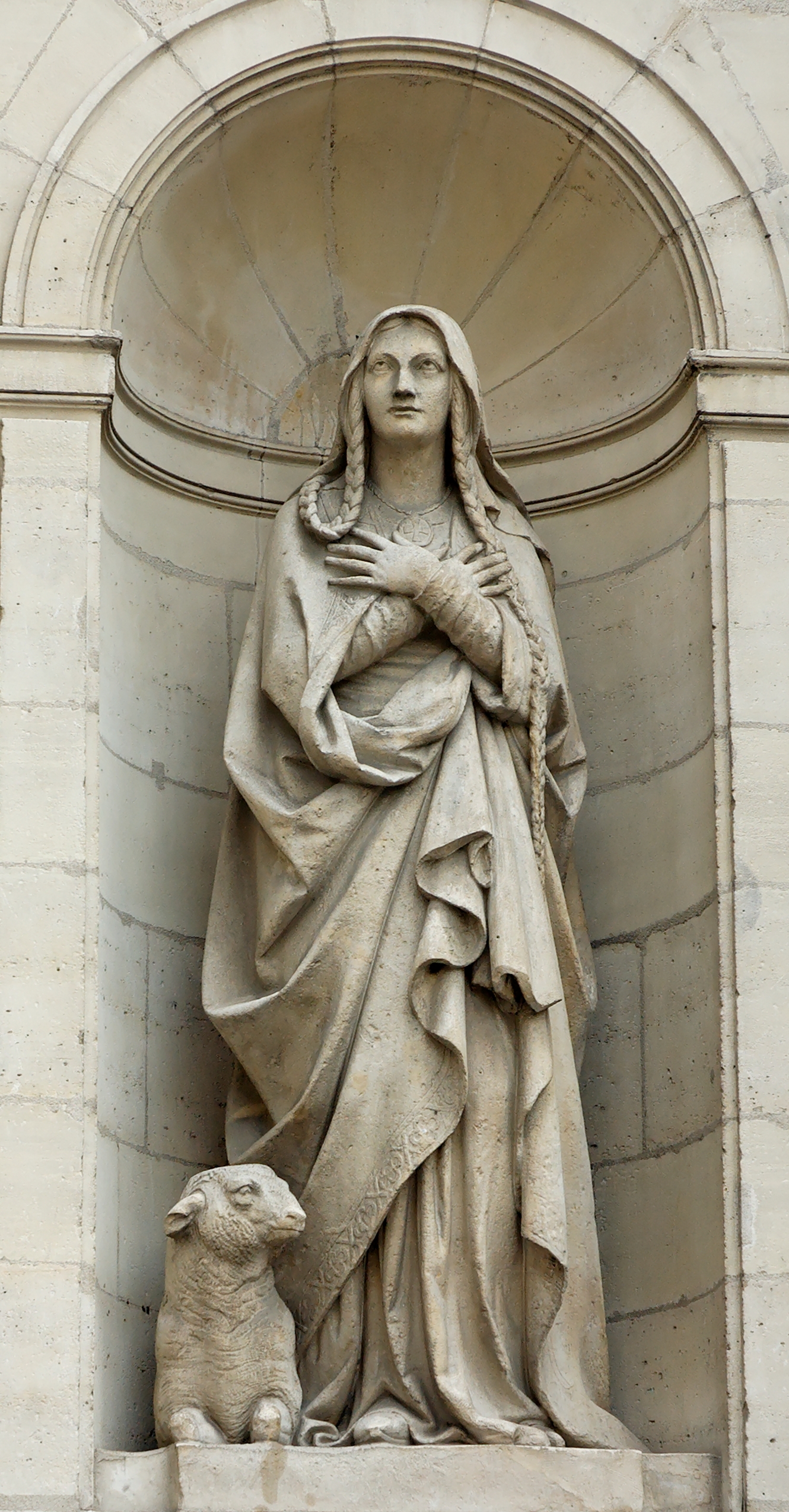 English: Statue of St. Genevieve by Pierre Hébert (French, 1804–1869). Façade of the 17th-century church Saint-Étienne-du-Mont ("St. Stephen in the Mount") in Paris.