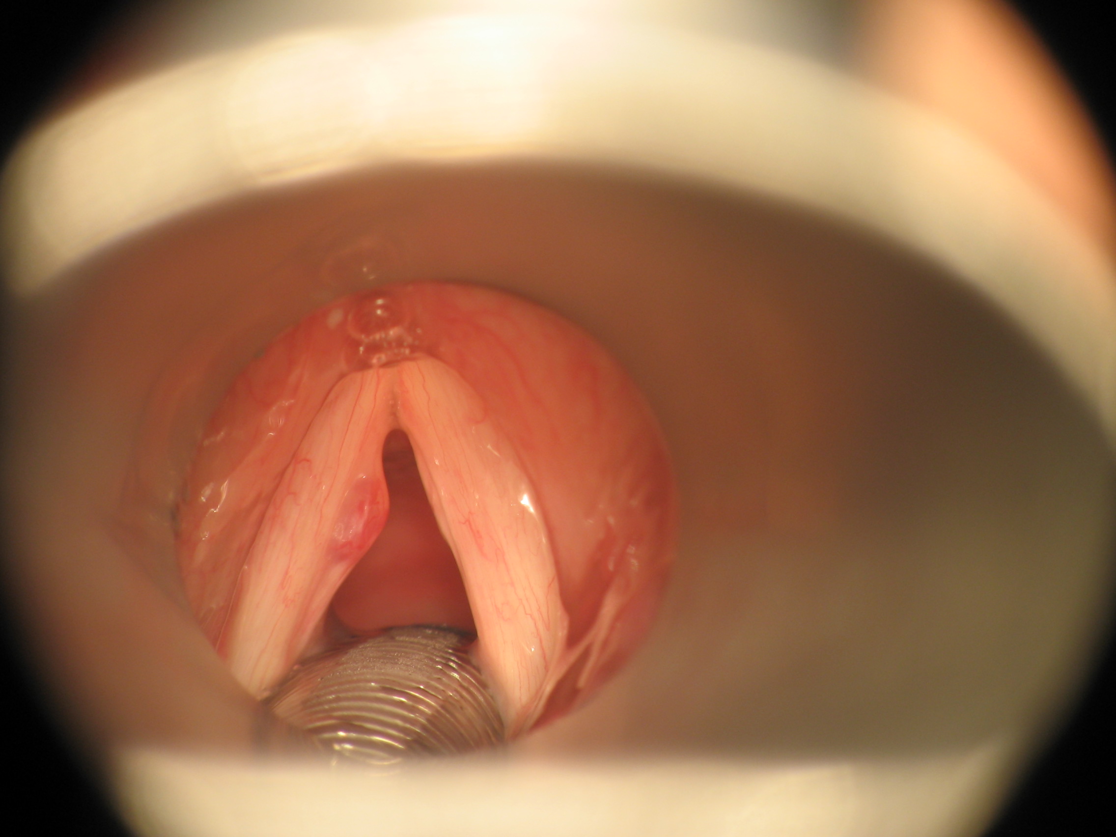 Description teleangiektatischer Stimmbandpolyp links, Blick auf die Stimmbänder durch das Metallrohr der Mikrolaryngoskopie