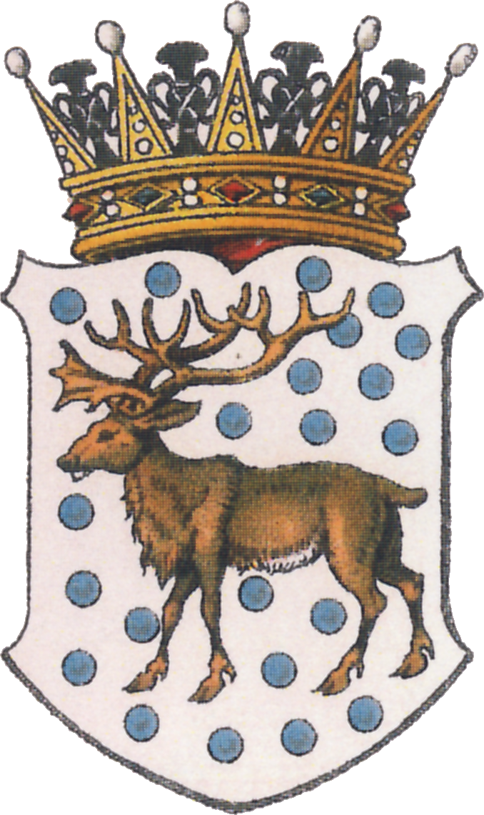 | Description | "Fig. 5. Wappen der schwedischen Landschaft Gestrikland, zum Gefleborg-Län gehörig. Im silbernen mit blauen Kugeln bestreuten Felde, ein schreitendes braunes Renntier. Der Schild ist mit einer rotgefütterten, schwedischen Herzogskrkone, aber ohne Haube (vergleiche Tafel XV. Fig. 37) geschmückt." |