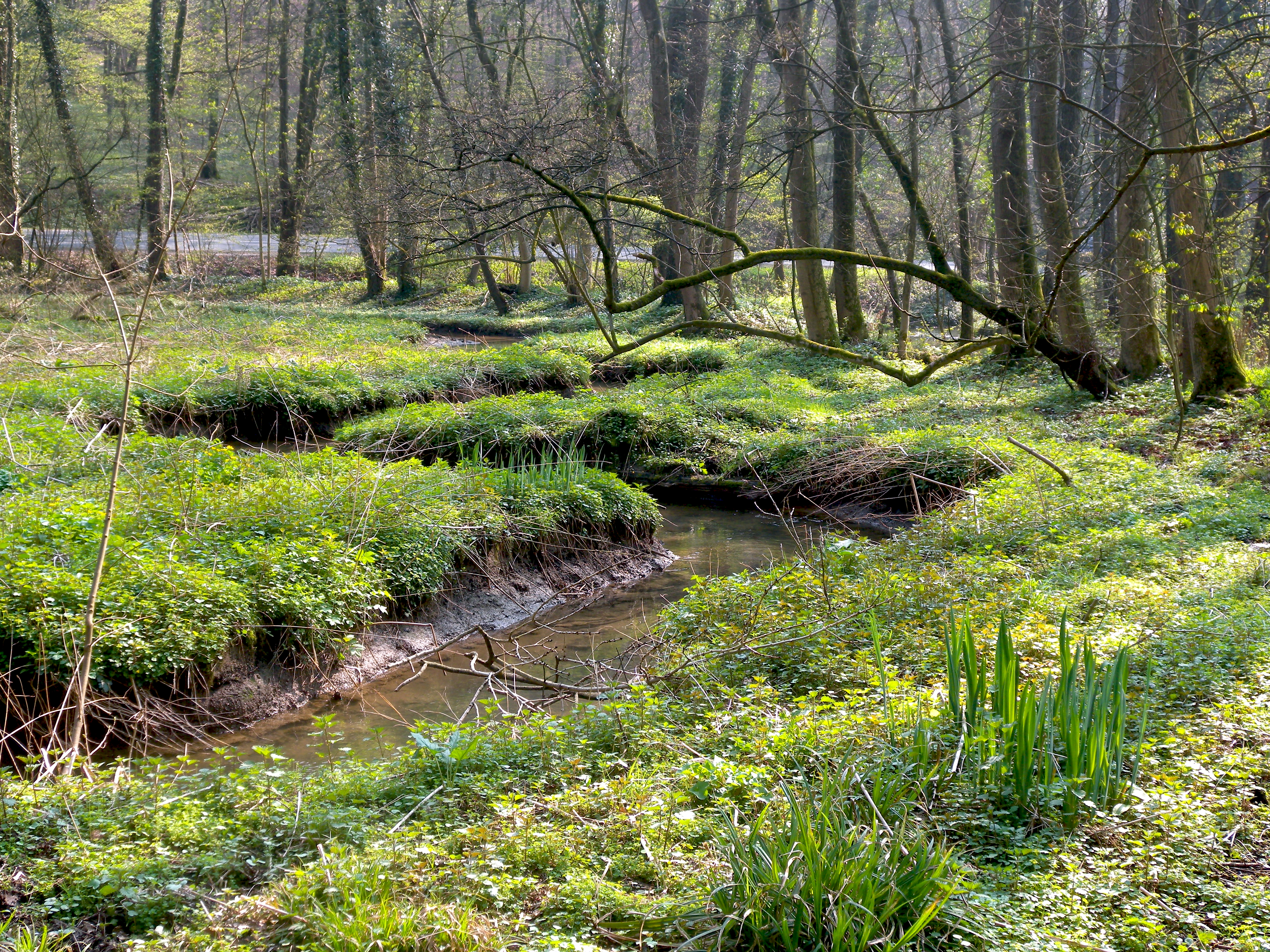 Deutsch: Der mäandrierende junge Strunder Bach (Strunde) im Frühjahr im Naturschutzgebiet „Strundetal“ nahe der Igeler Mühle zwischen Herrenstrunden und Dombach in Bergisch Gladbach; im Hintergrund die Kürtener Straße (L286) |