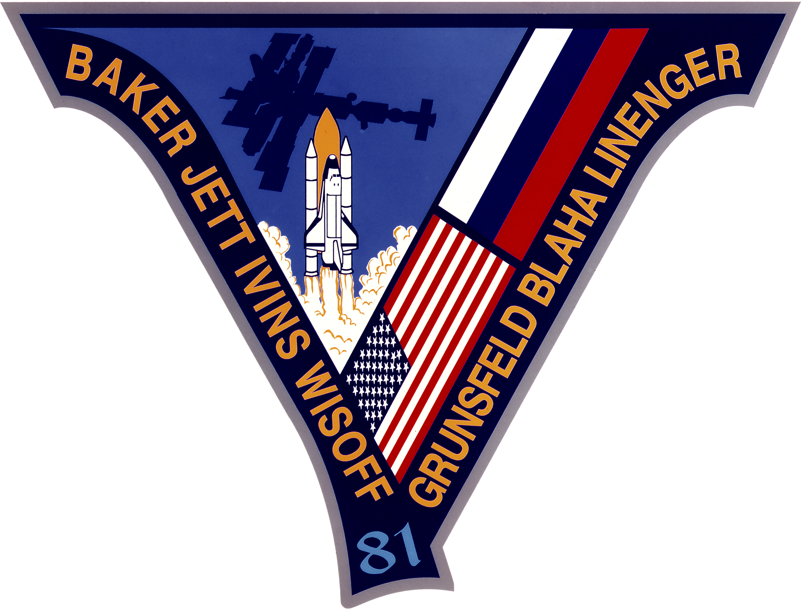 | Description | The crew patch for STS-81 , the fifth Shuttle-Mir docking mission, is shaped to represent the Roman numeral V. The Shuttle Atlantis is launching toward a rendezvous with Russia's Mir Space Station, silhouetted in the background. Atlantis and the STS-81 crew spent several days docked to Mir during which time Jerry M. Lineger (NASA-Mir-4) replaced astronaut John Blaha (NASA-Mir-3) as the U.S. crew member onboard Mir. The U.S. and Russian flags are depicted along with the names of the shuttle crew. |