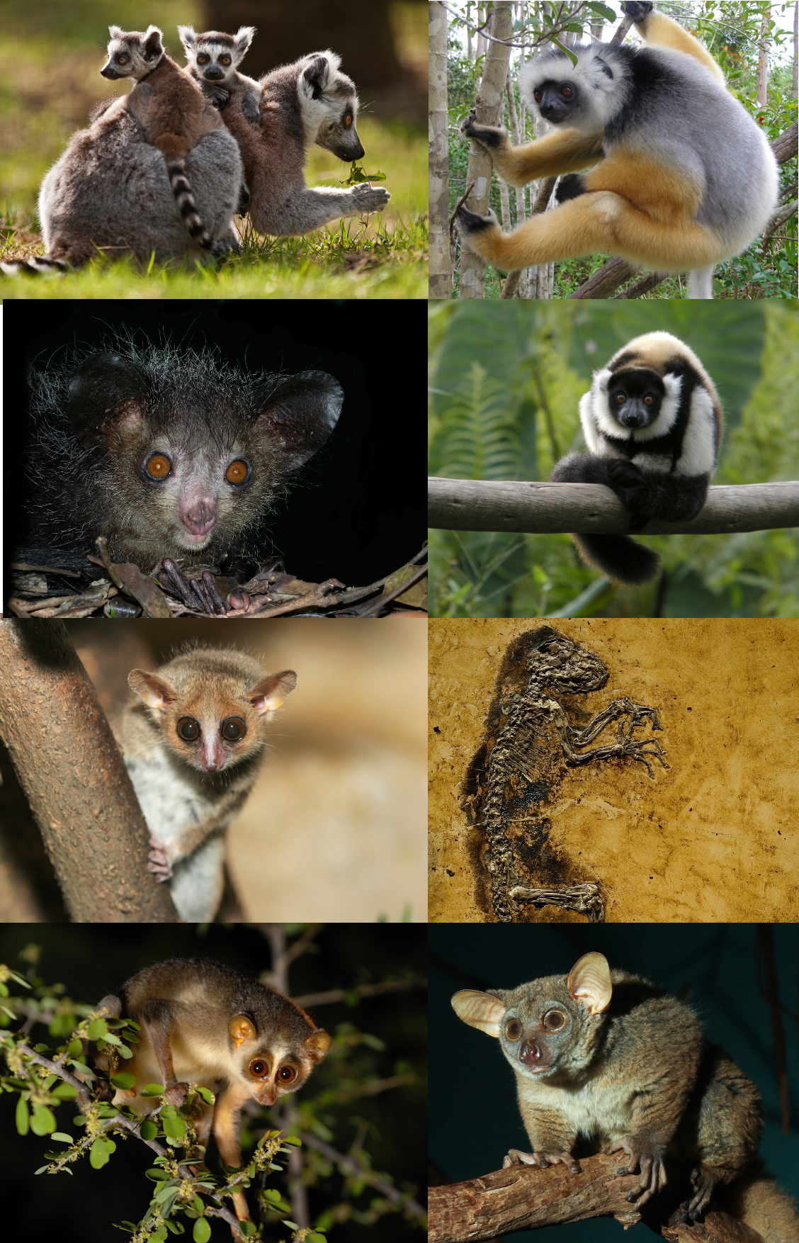 English: Variety of strepsirrhine primates, from top, left to right: