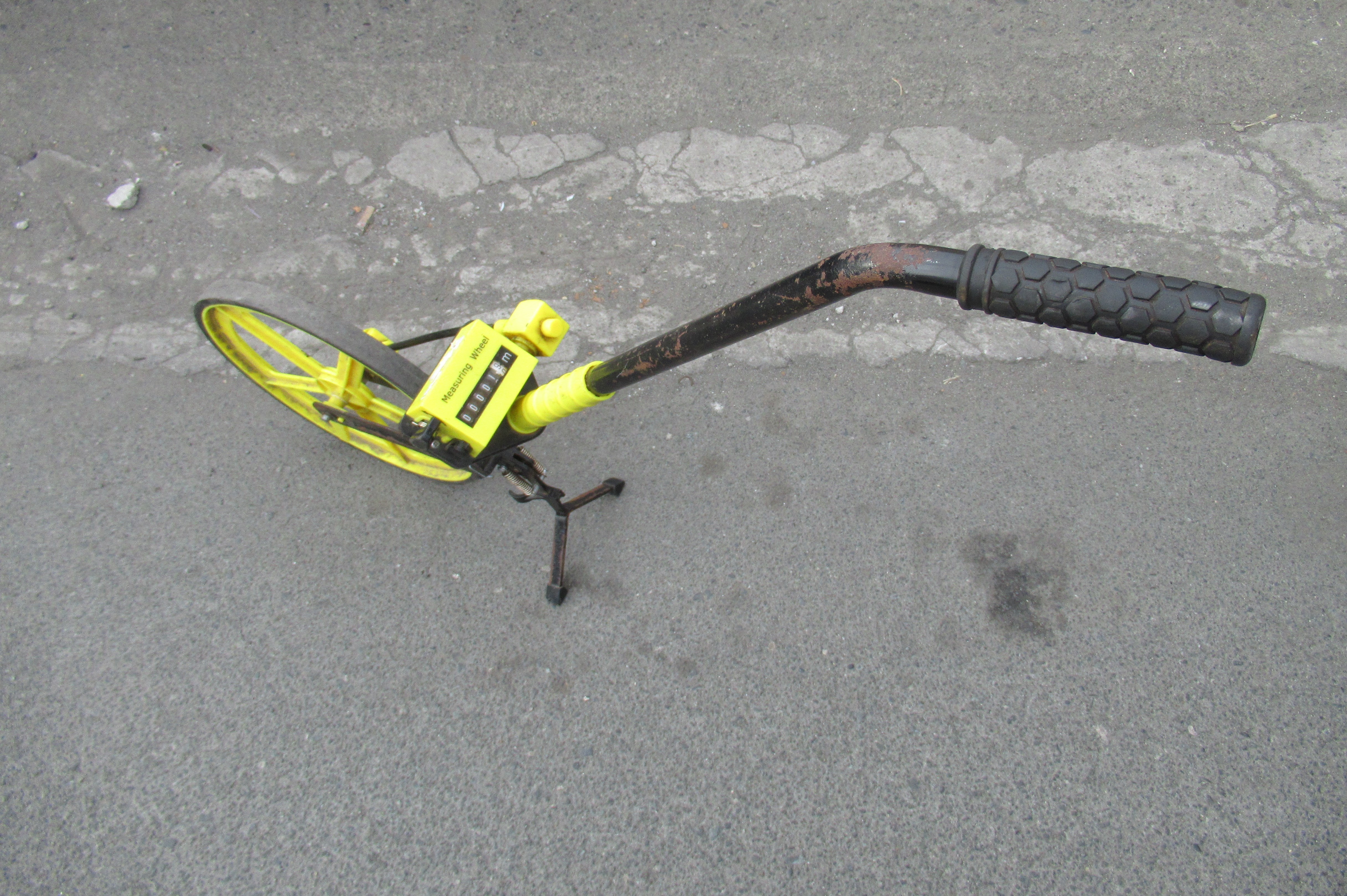 English: Surveyor's wheel Measuring wheel in Barangay Poblacion, Baliuag used by a PLDT worker to measure distances and record them for communication works. |