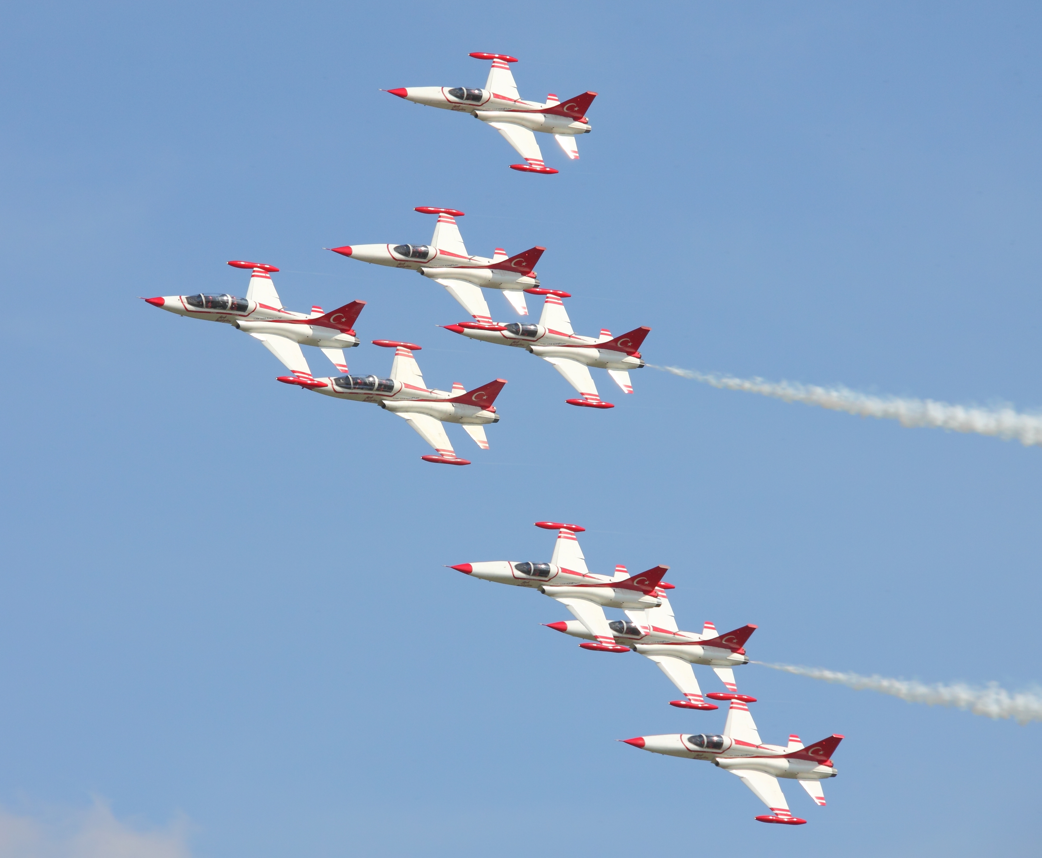 English: Türk Yıldızları (Turkish Stars) t the 2011 NATO Days in Ostrava. Polski: Türk Yıldızları (Tureckie Gwiazdy) w trakcie występu na Dniach NATO 2011 w Ostrawie. |
