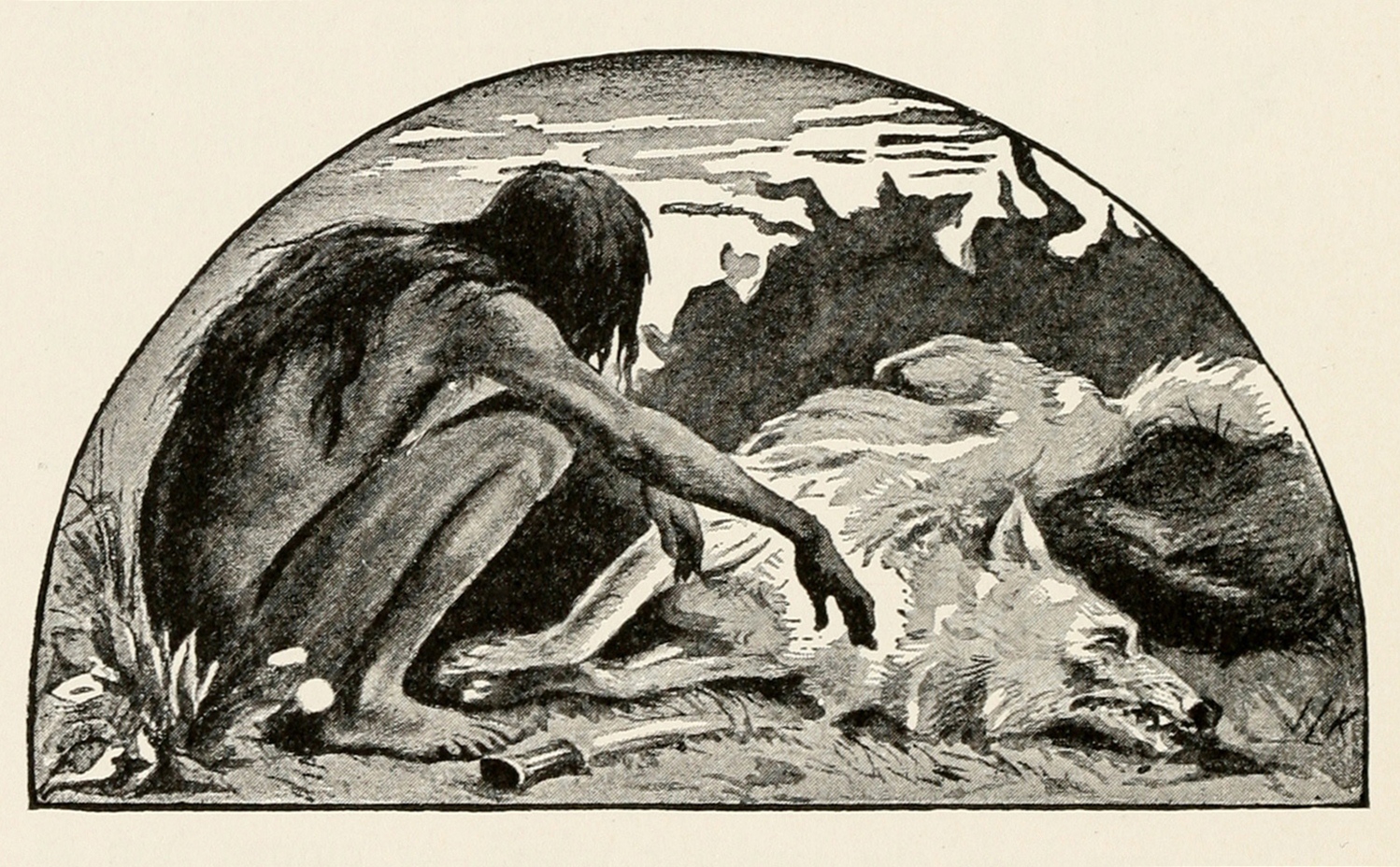 | Description | Illustration of Mowgli mourning a dead Akela. |