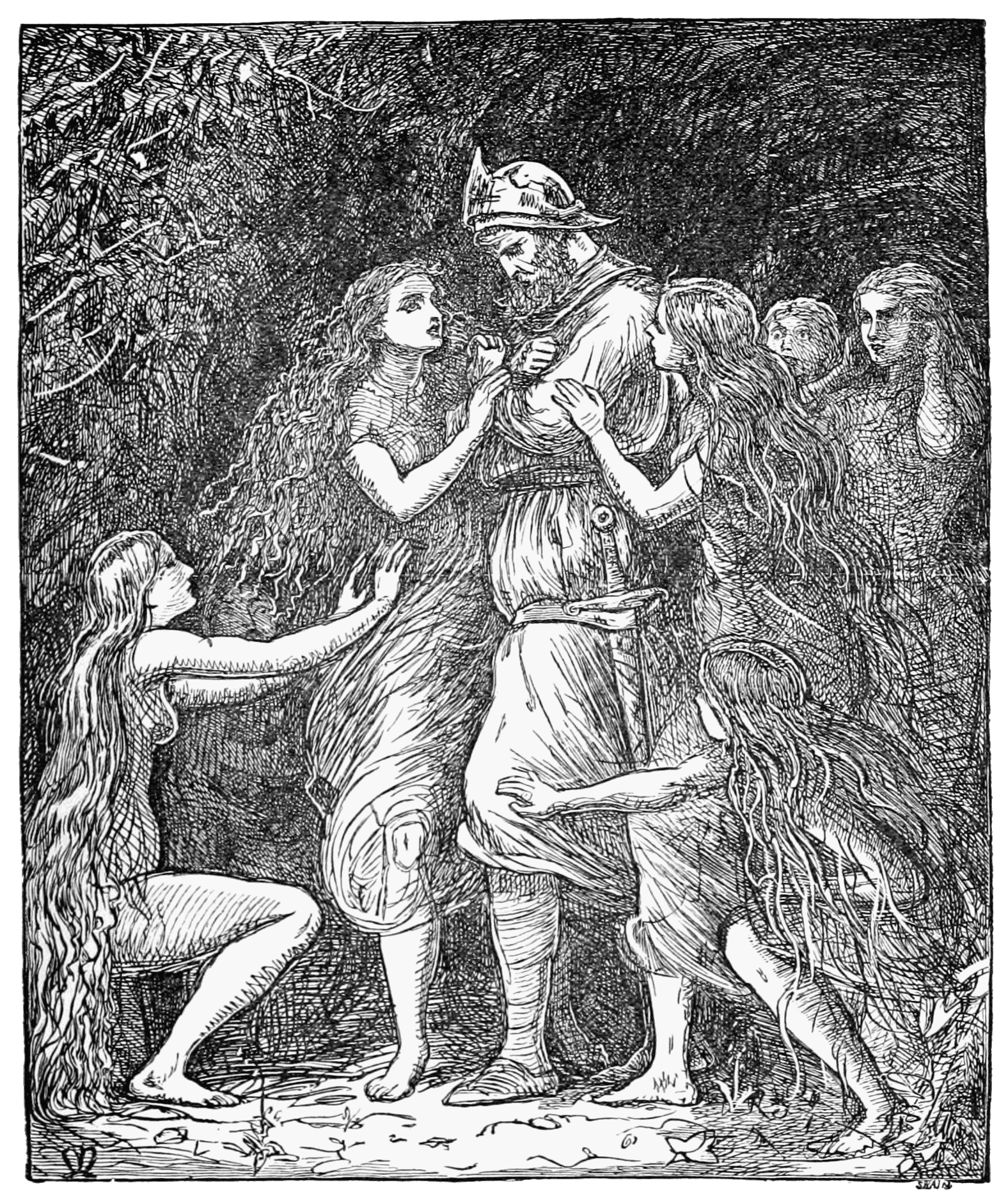 English: Illustration for Lady Duff Gordon's translation of the ballad "Tannhäuser." Tannhäuser has decided that he wants nothing more to do with Venus and the pagan women although they beg him to stay with them. |