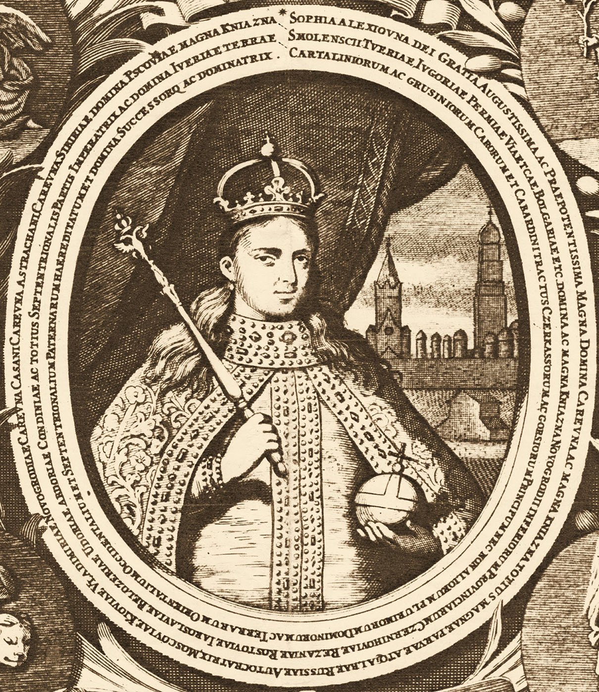 English: Sophia Alekseyevna (engraving by Leontij Tarasevich, 1680s)