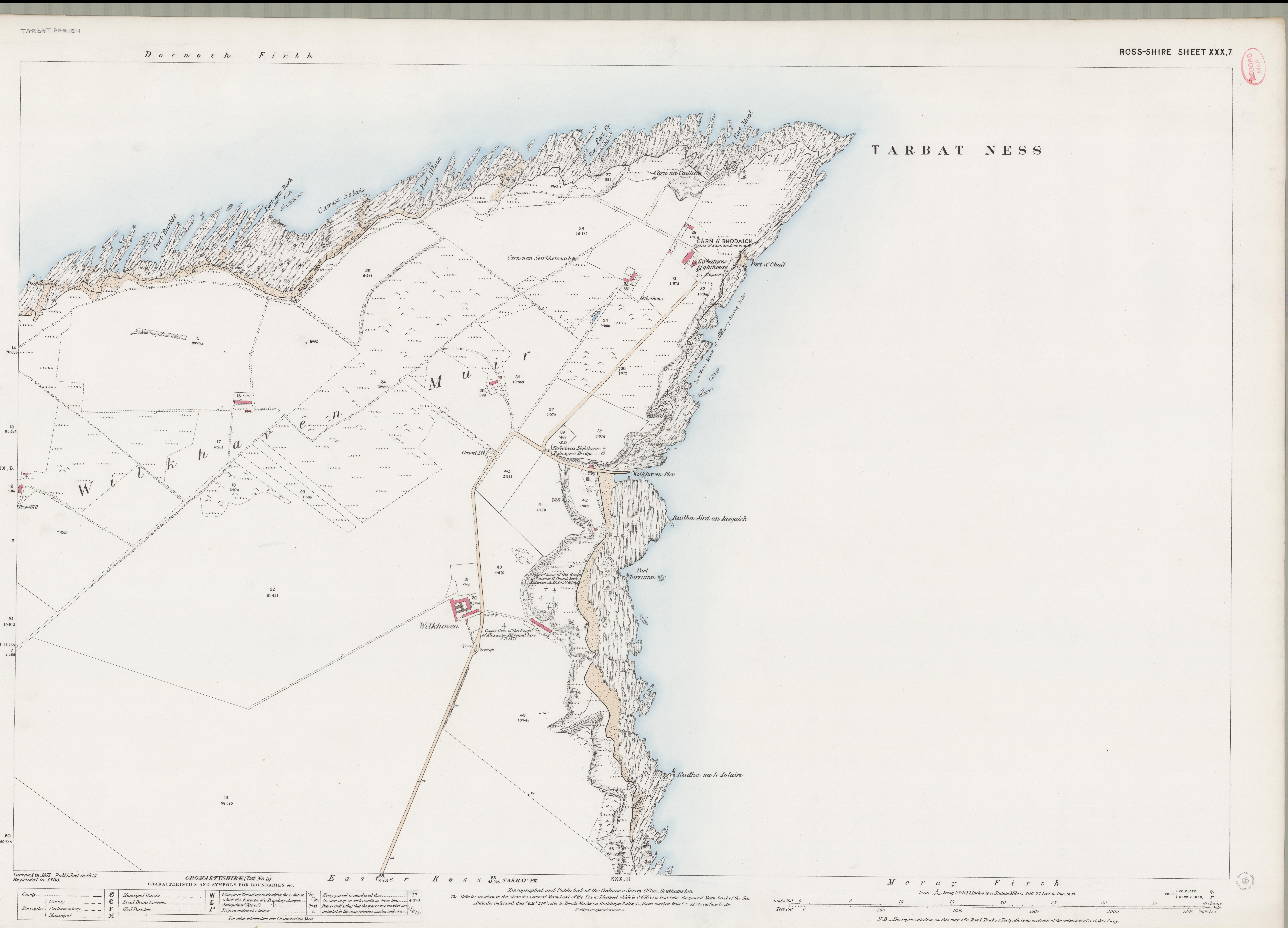 Deutsch: Topographische Karte des Ordnance Survey von 1873, Zeigt die Tarbat Ness genannte Nordspitze der Halbinsel Tarbat, Highlands, Schottland mitsamt dem Leuchtturm. English: Ordnance Survey map, published 1873. Shows promontory of Tarbat Pensinsula, which goes under the name of Tarbat Ness. Highland, Scotland. tarbat Ness lighthouse is shown as well. |