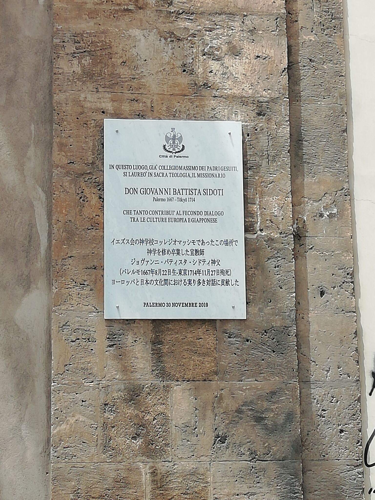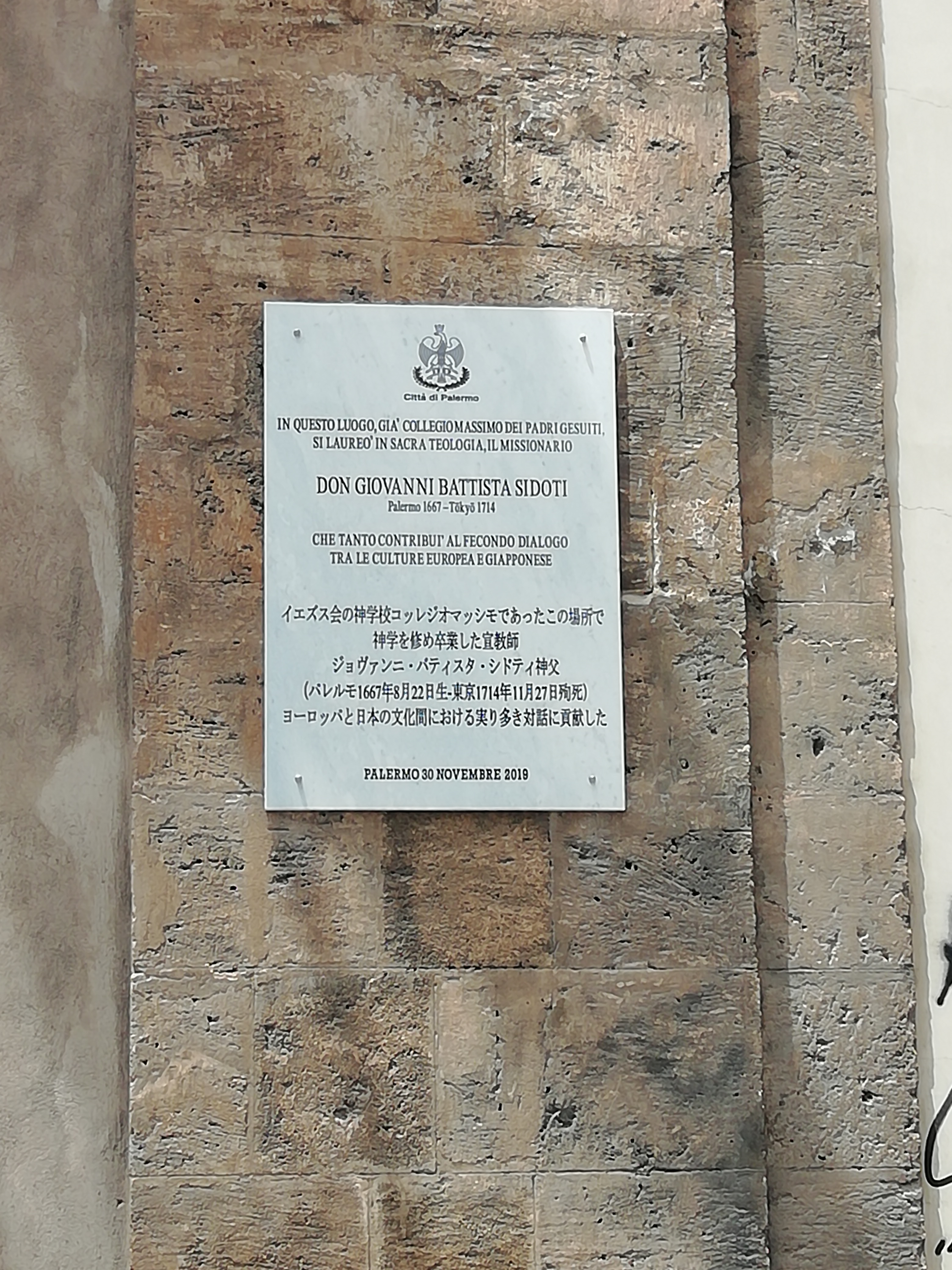 Italiano: targa commemorativa a don Giovanni Battista Sidotti a Palermo |