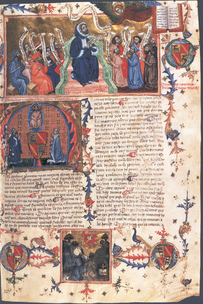 English: One of the first folios of the Terç del Crestià (Third Volume of Lo Crestià), in the 15th-century manuscript number 1792 of the National Library of Spain (BNE) in Madrid. This manuscript dates from the 15th century and is a copy of the original written by Francesc Eiximenis in 1384, which forms part of his encyclopedic work entitled Lo Crestià (1379-1392). |