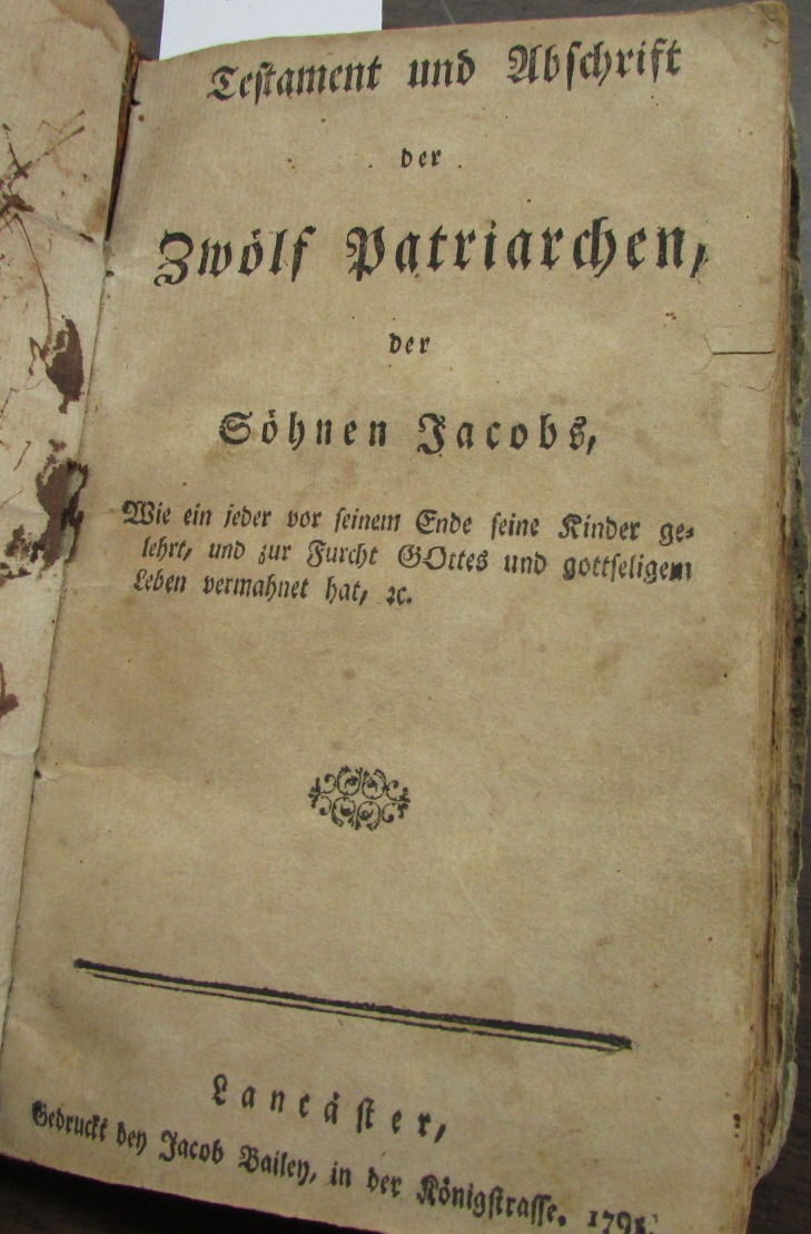 English: Testament und Abschrift der Zwölf Patriarchen (Testament of the Twelve Patriarchs), Lancaster, Bailey Imprint: 1791.