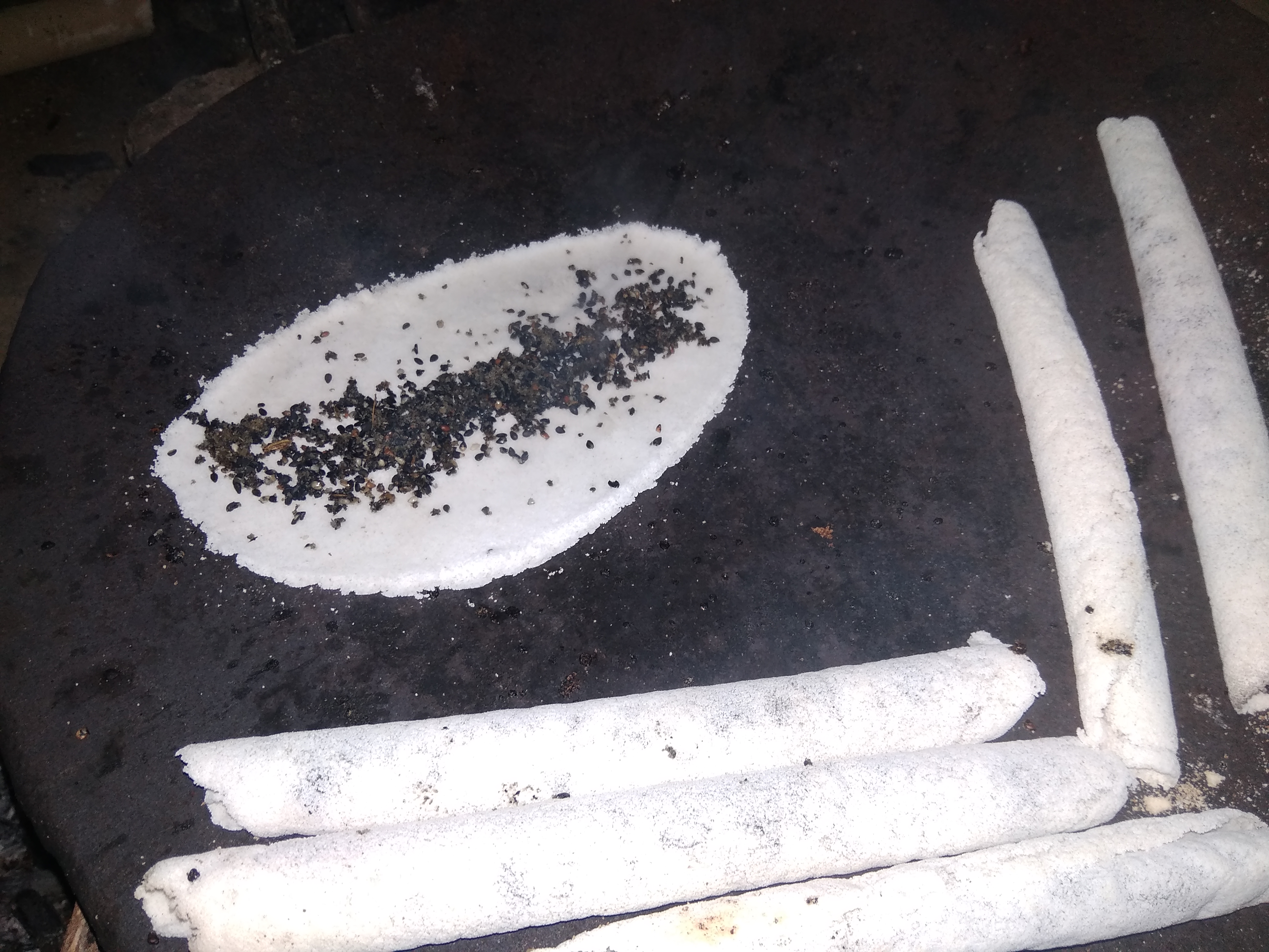 English: This is made with sesame and rice. The rice flour is spread in a circle on a pan, basically made of cast iron and heated. The roasted sesame seeds are placed in the circle along with sugar or jaggery and rolled. These are cylindrical shaped, more like a cigar. |