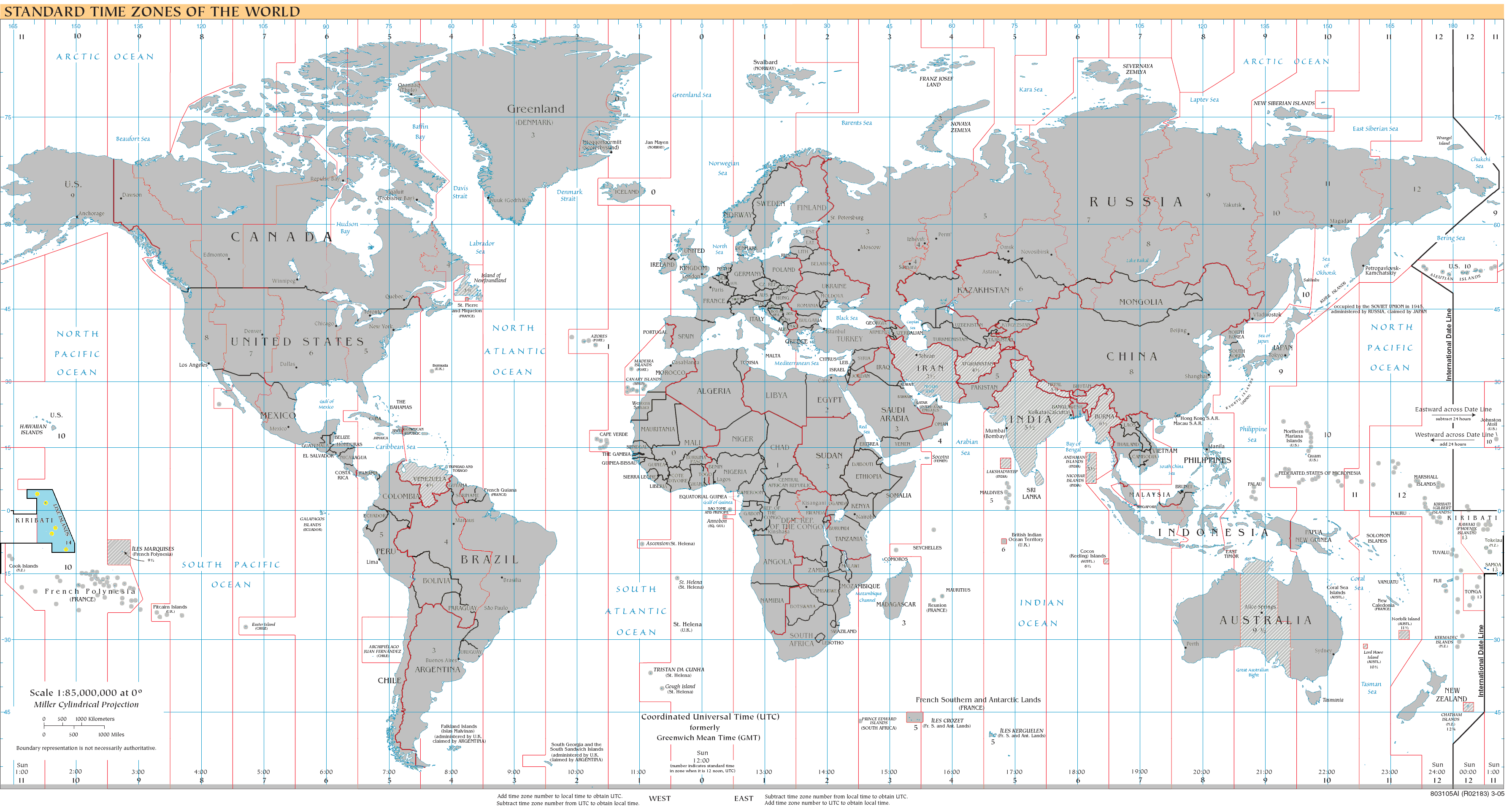 English: World map of time zones as of 2008, on the Miller Cylindrical Projection and with highlighted UTC+14 zone. |