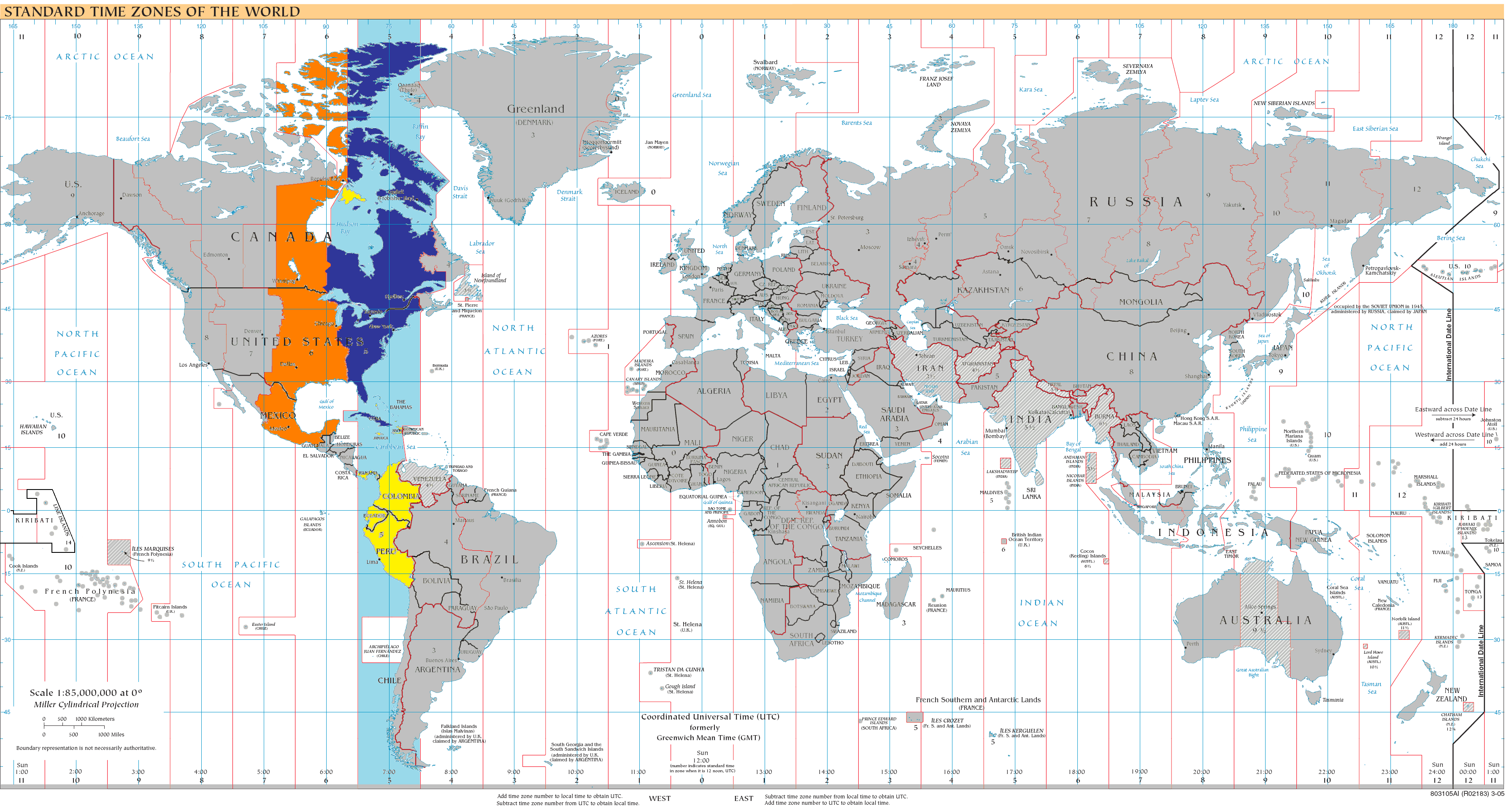 English: World map of time zones as of 2008, on the Miller Cylindrical Projection and with highlighted UTC-5 zone.