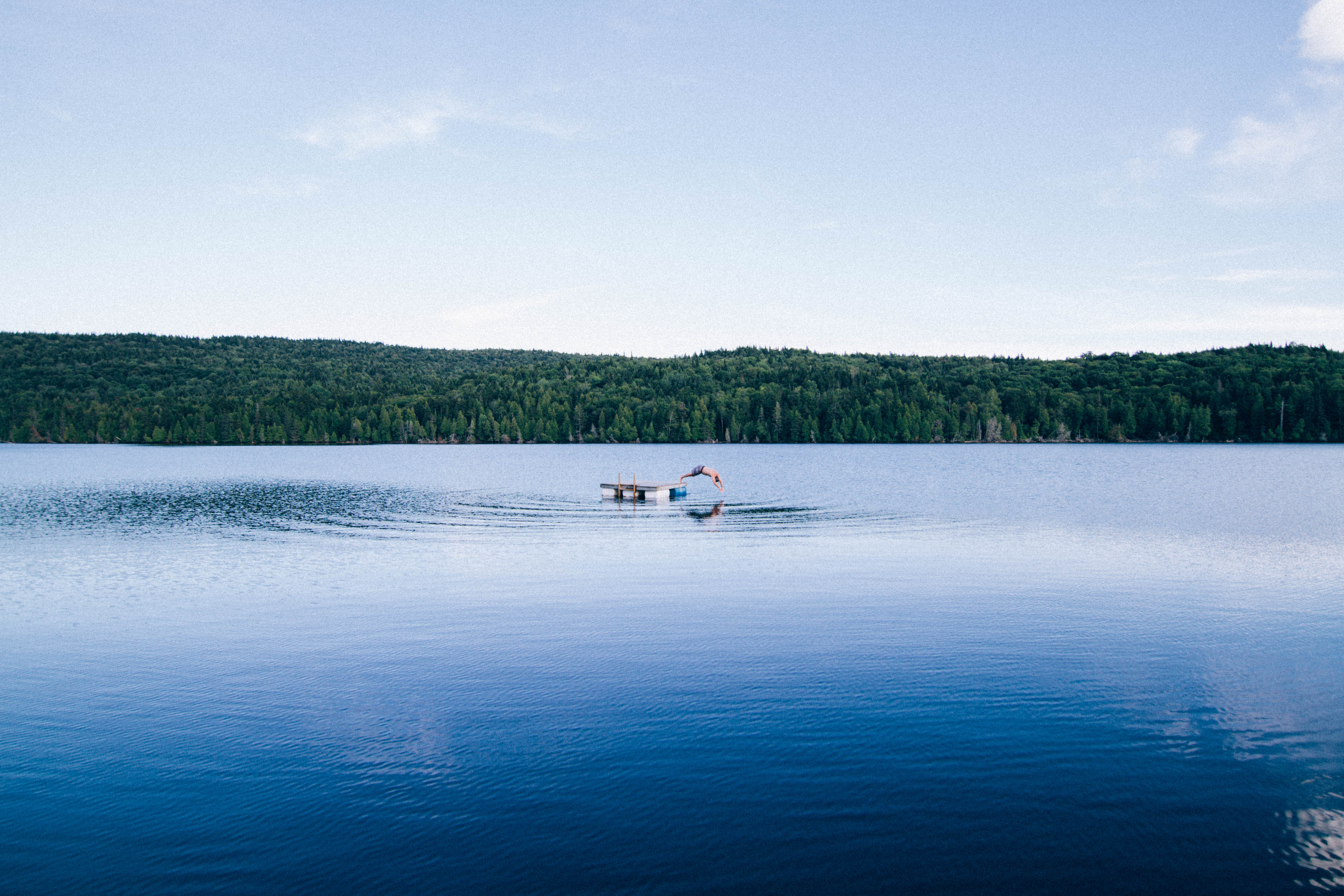 | Unsplash description | A person leaping into the water from a platform in the middle of a lake |